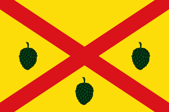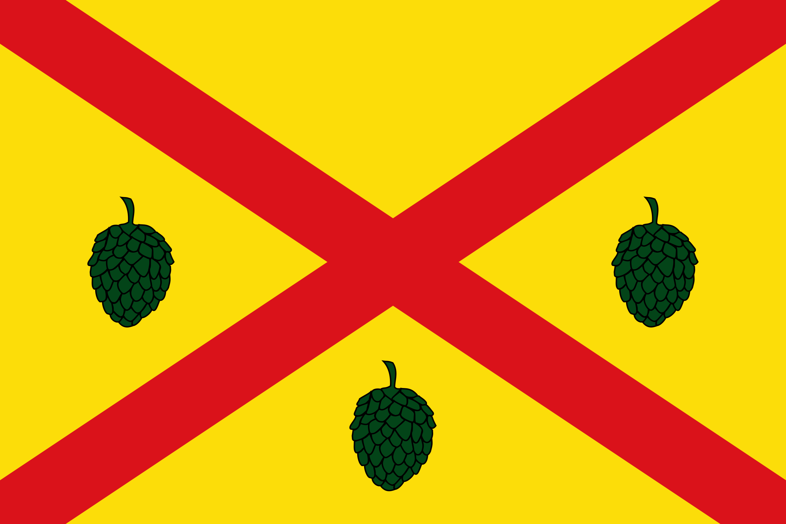 Español: Bandera apaisada, de proporciones dos de alto por tres de largo, amarilla, con un aspa roja de brazos de grueso 5/36 de la altura del paño, con las tres piñas verde oscuro del escudo puestas con el tallo arriba, cada una de altura 1/4 de la del paño y anchura 1/9 de la largura del mismo paño, las de los lados equidistantes de los bordes superior e inferior y puestas a 1/9 de los del asta y del vuelo respectivamente, y la de abajo centrada y puesta a 1/16 del borde inferior.[2]
