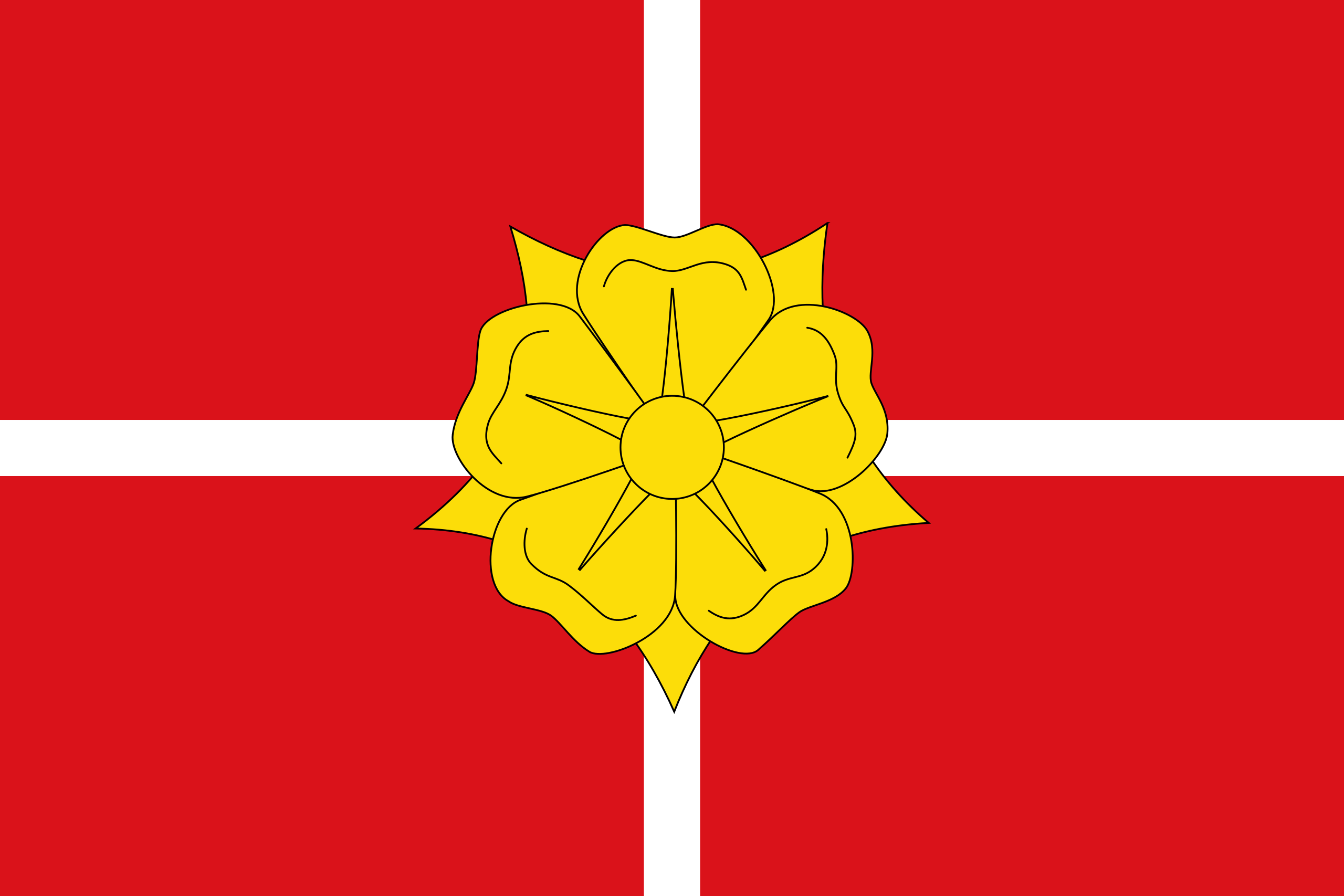 Español: Bandera apaisada, de proporciones dos de alto por tres de largo, roja, con una cruz llena blanca de brazos de grueso 1/16 de la altura del paño y con la rosa amarilla del escudo, de diámetro 37/64 de la misma altura, sobrepuesta en el cruce.[2]