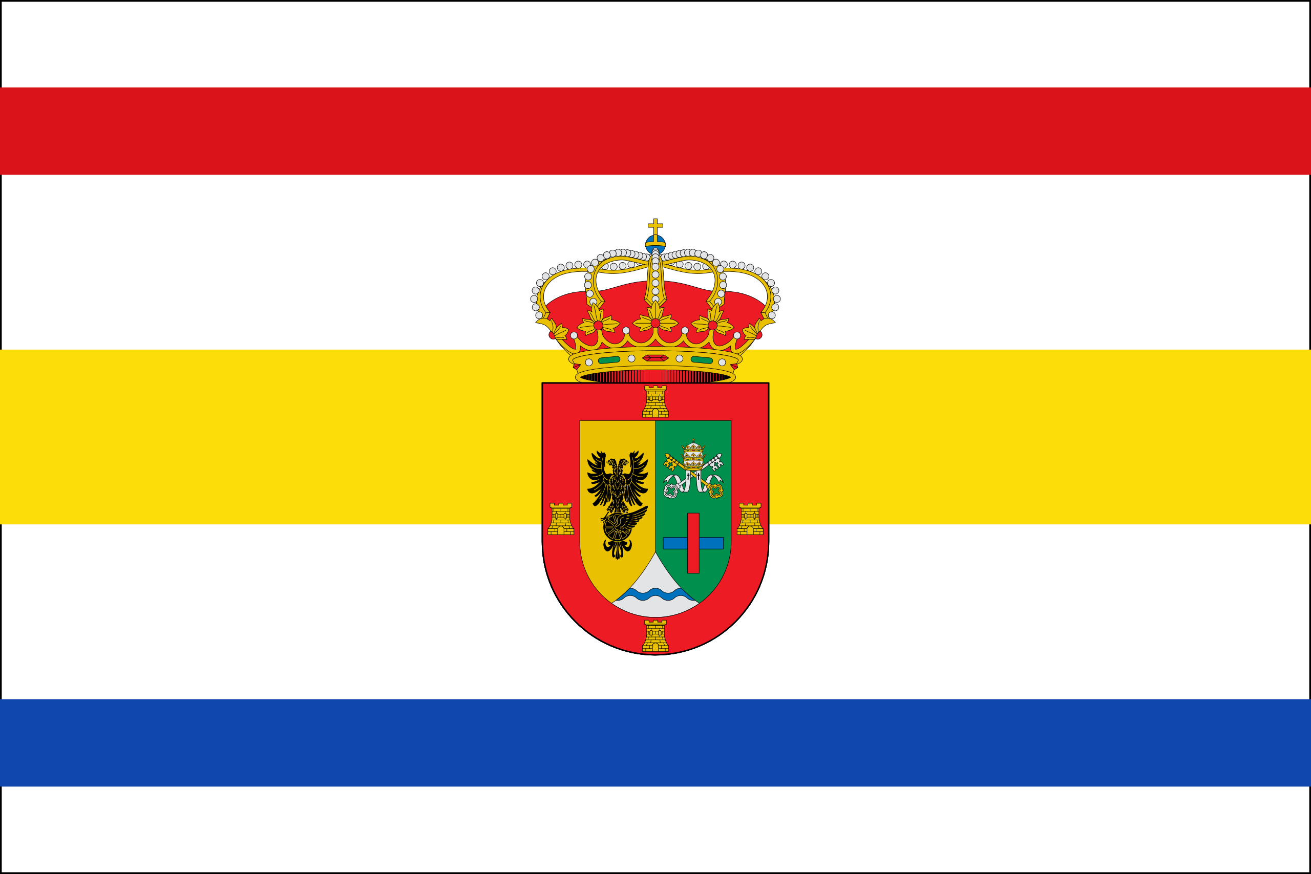 Cuadrada, o de 1:1 (en realidad, 2:3). Fondo blanco. A 1/10 [del borde superior,] franja horizontal de 1/10 de anchura en rojo; franja horizontal azul de la misma anchura a 1/10 de la parte inferior de la bandera y franja central amarilla con una anchura de 1/5. En el corazón de la bandera campeará el escudo municipal. Referencia: B.O.C.yL. nº 204 de 21/10/2002 |