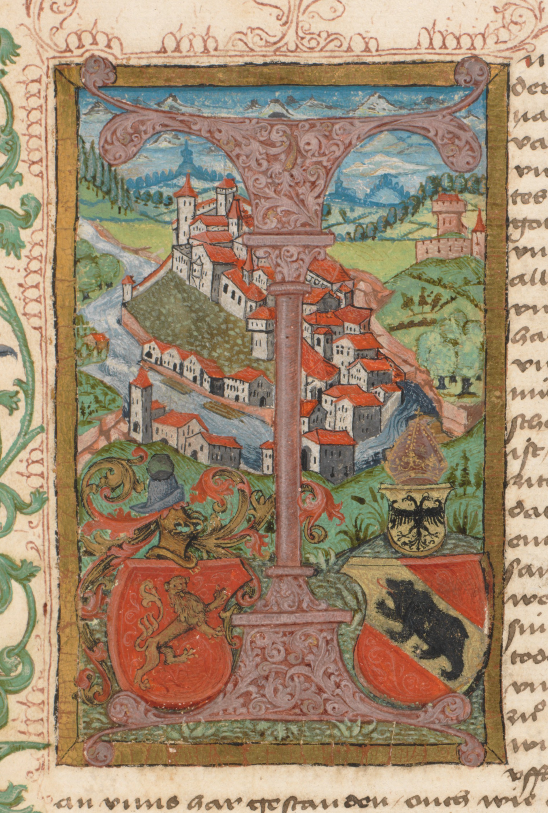 English: Berne in the capital "I" of an inital of the Spiezer Chronik of Diebold Schilling, 1485. Left, the Zähringer Coat of Arms; right, the Bernese Coat of Arms, surmounted by the Imperial Eagle as the sign of an Imperial Free City. This is the earliest extant image of Berne.