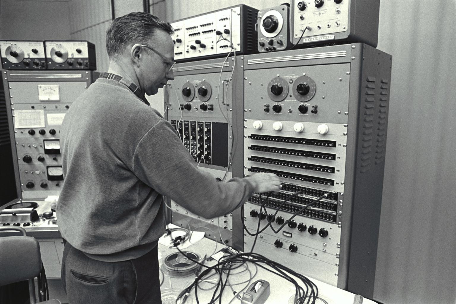 English: Leslie Bassett works in the University of Michigan Electronic Music Studio. No specific date, probably early 1969.