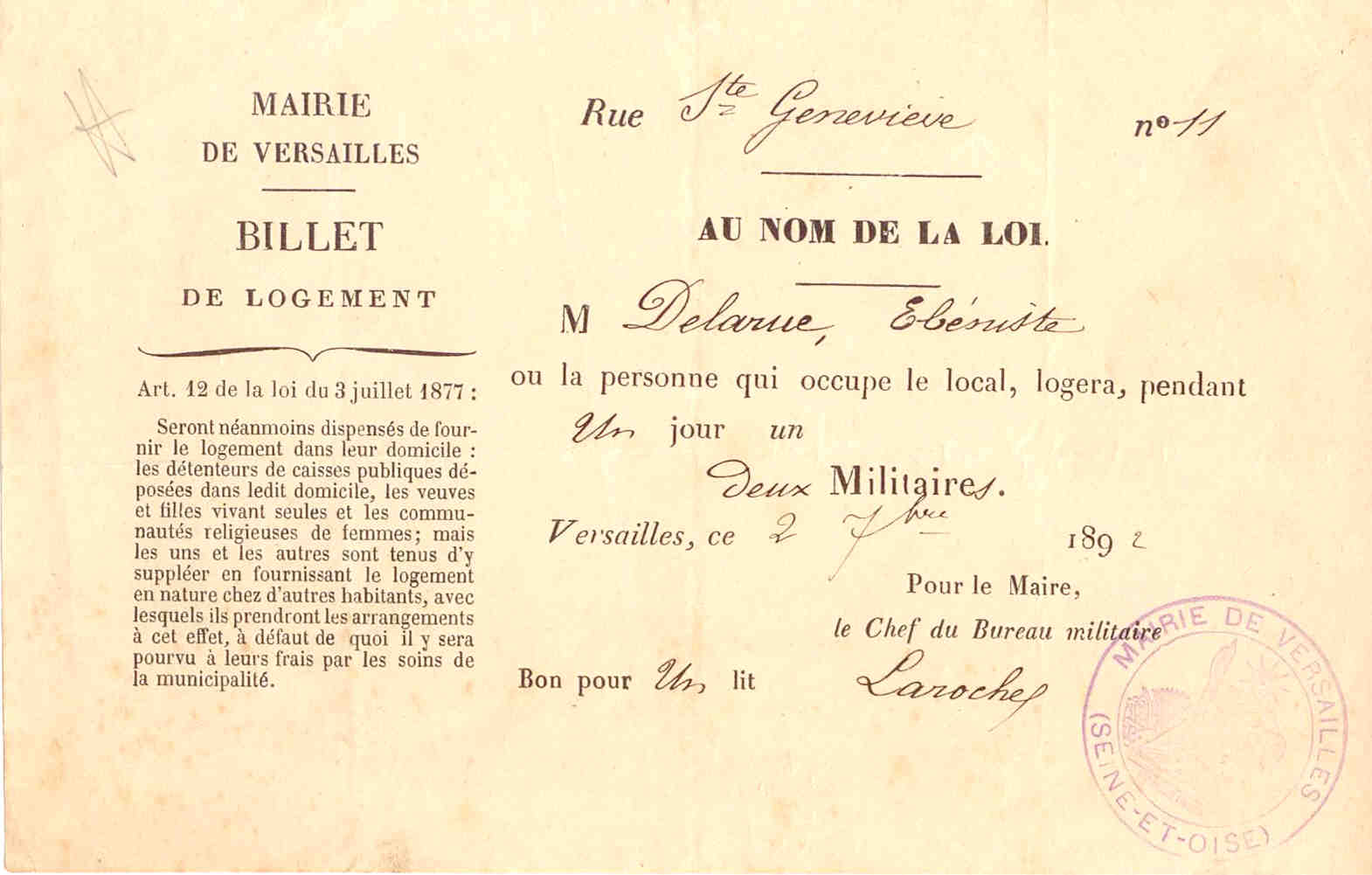 Français : Billet de logement chez l'habitant pour deux militaires, Versailles 1892.