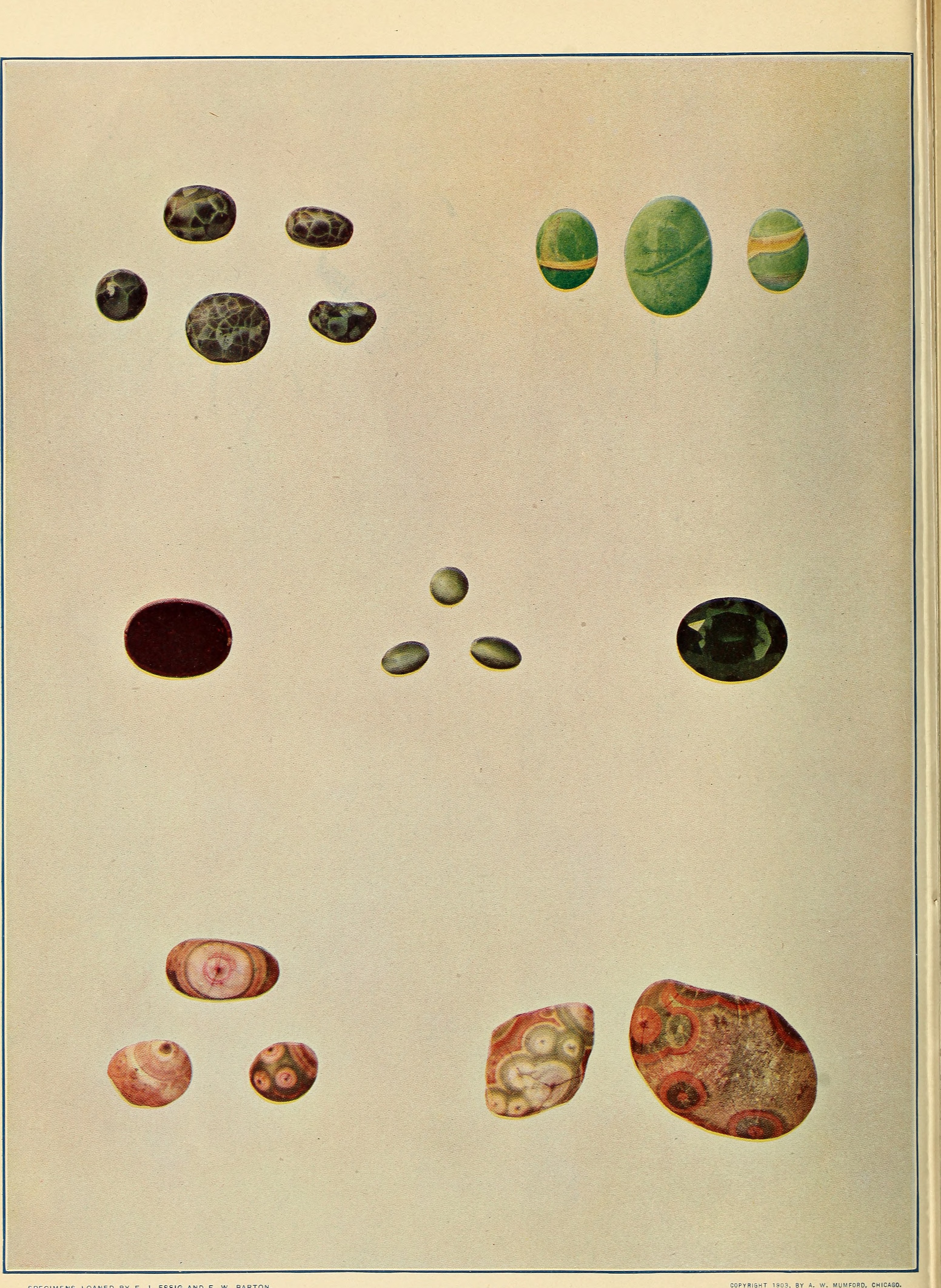 SPECIMENS LOANED BY F. J. ESSIG AND F. w. BARTON. 590 Chlorastrolite, polished (Isle Royale).Hematite, polished (England;. Thomsonite, polished (Lake Superior). UWFORD, CHICAGO. MINOR GEMS.Cats-eye, Quartz, polished rCeylon). Variscite. polished (Utah). Moldavite, cut (Bohemia).Thomsonite, rough (Lake Superior;. MINOR GEMS. The stones represented in the accom-panying colored plate have, for the mostpart, but limited use, either becauseof their local occurrence or their lackof special gem qualities. Three of themare peculiar to the United States, anddeserve on that account perhaps to bebetter known and more widely used byour people. These are variscite, chlor-astrolite and thomsonite. VARISCITE. Variscite resembles turquois in manyproperties, being, like that mineral, a gen-erally opaque, hydrous phosphate ofaluminum not occurring in distinctcrystals. Its color is, however, normallyan apple-green to emerald-green, ratherthan blue, and its luster is more nearlyvitreous than that of turq