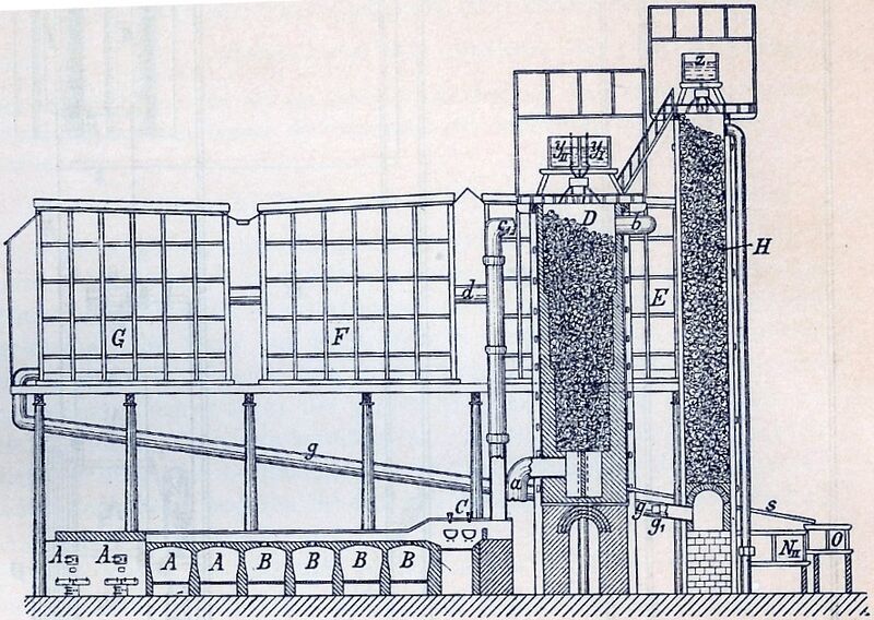 Deutsch: Schwefelsäurefabrik nach dem Bleikammerverfahren, Ansicht von vorn. A, B) Röstöfen für Pyrit, C) Salpeterofen mit 2 Schalen für Schwefelsäure und Salpeter zur Freisetzung nitroser Gase, D) Gloverturm, E,F,G) Bleikammern, H) Gay-Lussac-Turm.