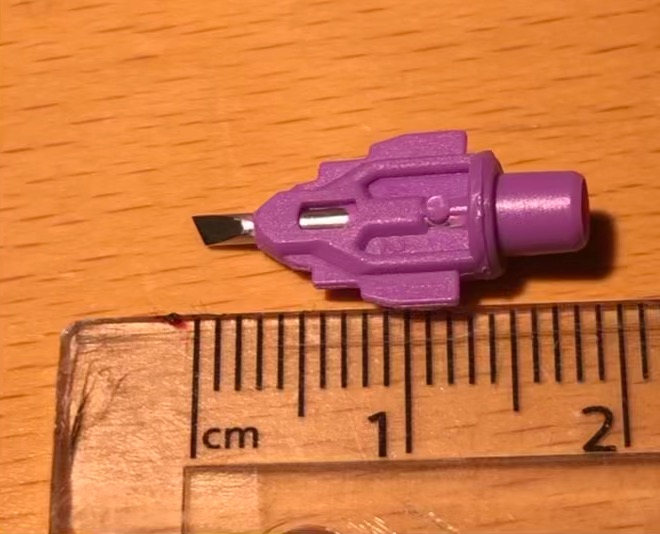 English: Blade extracted from disposable self retracting blood lancet with ruler for scale.
