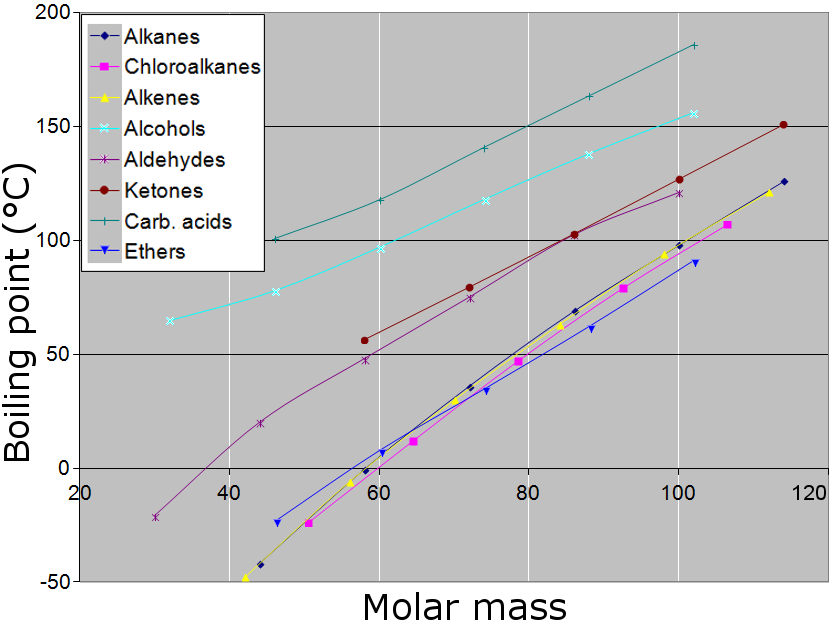 English: Graph showing the boiling points of alkanes, alkenes, ethers, halogenoalkanes, aldehydes, ketones, alcohols and carboxylic acids as a function of molar mass. In all cases, boiling points of straight-chain compounds are used. All the curves show approximately the same gradient. Grouping of the curves shows the difference in strength between induced dipole-induced dipole forces (alkanes, alkenes, ethers and halogenoalkanes), permanent dipole-permanent dipole forces which raise the boiling points of aldehydes and ketones, and finally the strongest intermolecular hydrogen bonding in alcohols and carboxylic acids. Carboxylic acids have higher boiling points than alcohols due to the further presence of the polar C=O bond. قالب:Mt