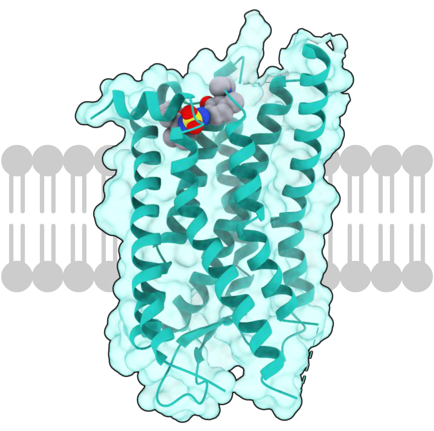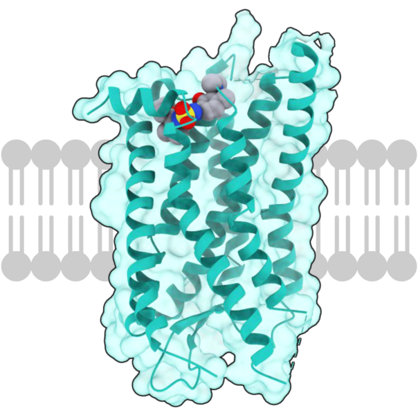 Español: Receptor de quimiocinas CCR7 humano unido al ligando Cmp2105 (coloración CPK). Imagen creada a partir del archivo PDB 6QZH y representada con ChimeraX.