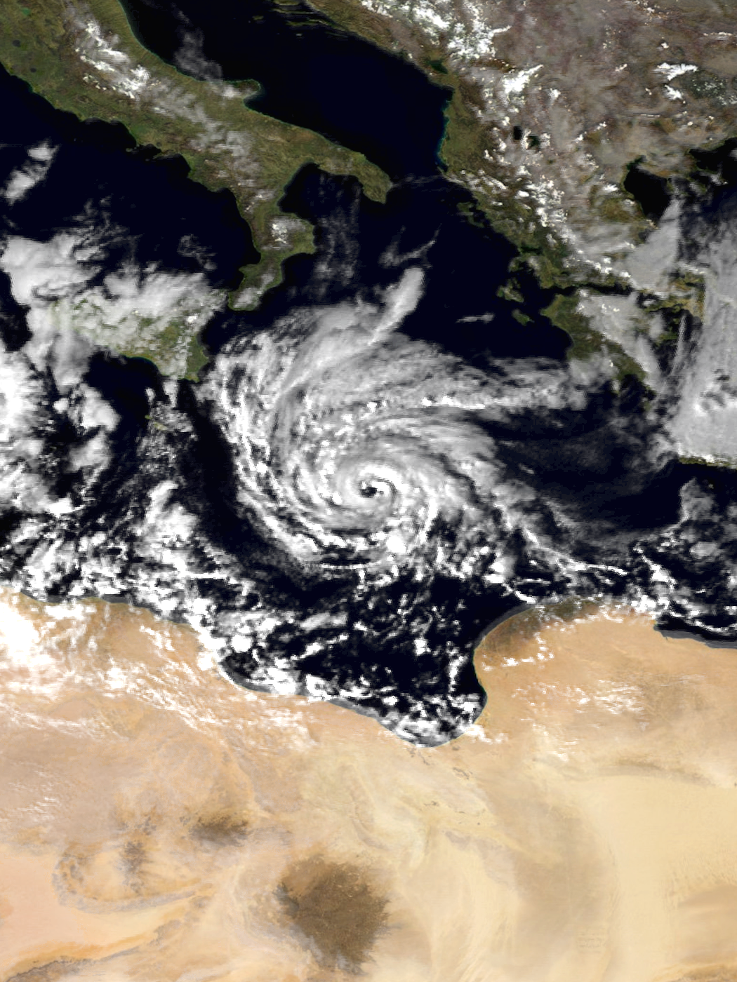English: EUMETSAT visible satellite image of Mediterranean Tropical Cyclone "Celeno" at 14:00 UTC on January 16, 1995