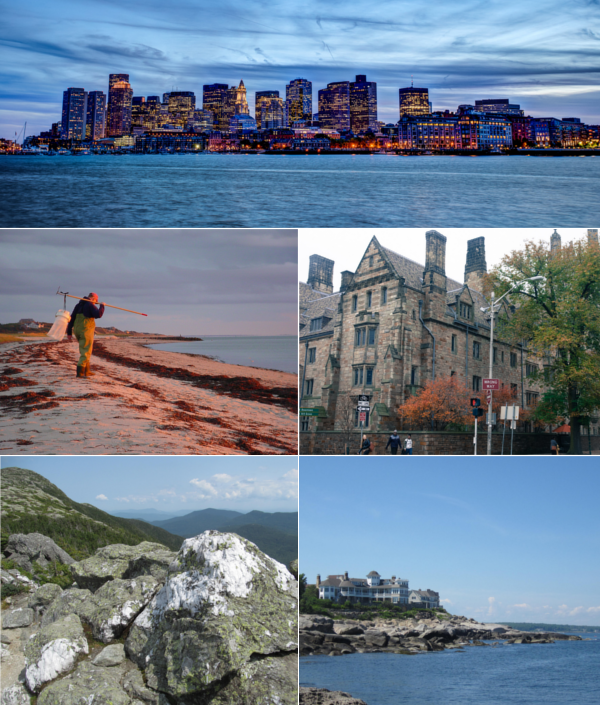 English: Collage of images related to New England. Clockwise from top: skyline of Boston, Massachusetts at night; building of Yale University in New Haven, Connecticut; Nubble Light on Cape Neddick, Maine; view from Mount Mansfield, Vermont; and a fisherman on Cape Cod, Massachusetts.