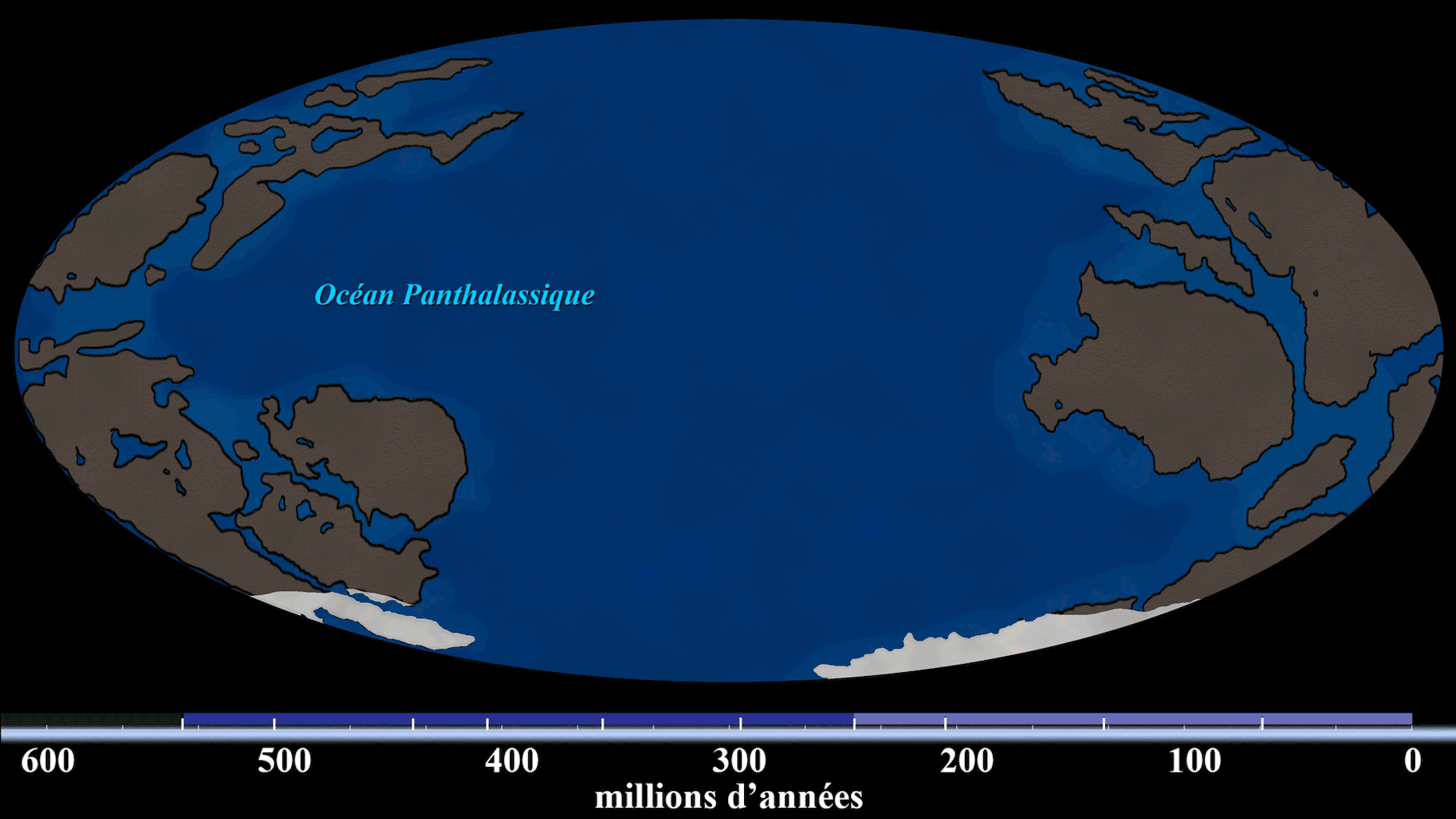 I just needed to show the general trend of continental drift, the formation of Pangea (the supercontinent), and its break up, until continents reach today's positions. The first frame starts at 740 million years, the last frame is today. Each frame moves forward in time approx 10-to-20 million years. Feel free to use this animation, or any part of it, in any way your heart desires. Cheers! -- Images dessinées à la main, inspirées de plusieurs images en basse-résolution de déplacements des continents. Les positions 'entre-deux' ont été extrapolées à partir d'images existantes - ce que j'ai perdu en précision, j'ai gagné en fluidité des déplacements. Ceci n'est *pas* une représentation scientifique exacte. S.V.P. ne vous basez pas sur ces cartes pour effectuer des fouilles archéologiques! J'avais simplement besoin de montrer la tendance générale des continents lors de leurs déplacements, la formation du supercontinent Pangée, et son morcellement jusqu'aux positions actuelles des continents. La première image se situe autour de 740 millions d'années, la dernière image montre les positions actuelles. Chaque nouvelle image avance dans le temps d'environ 10-à-20 millions d'années. Vous pouvez utiliser cette animation, ou n'importe quelle portion, comme bon vous semble. Au plaisir! |