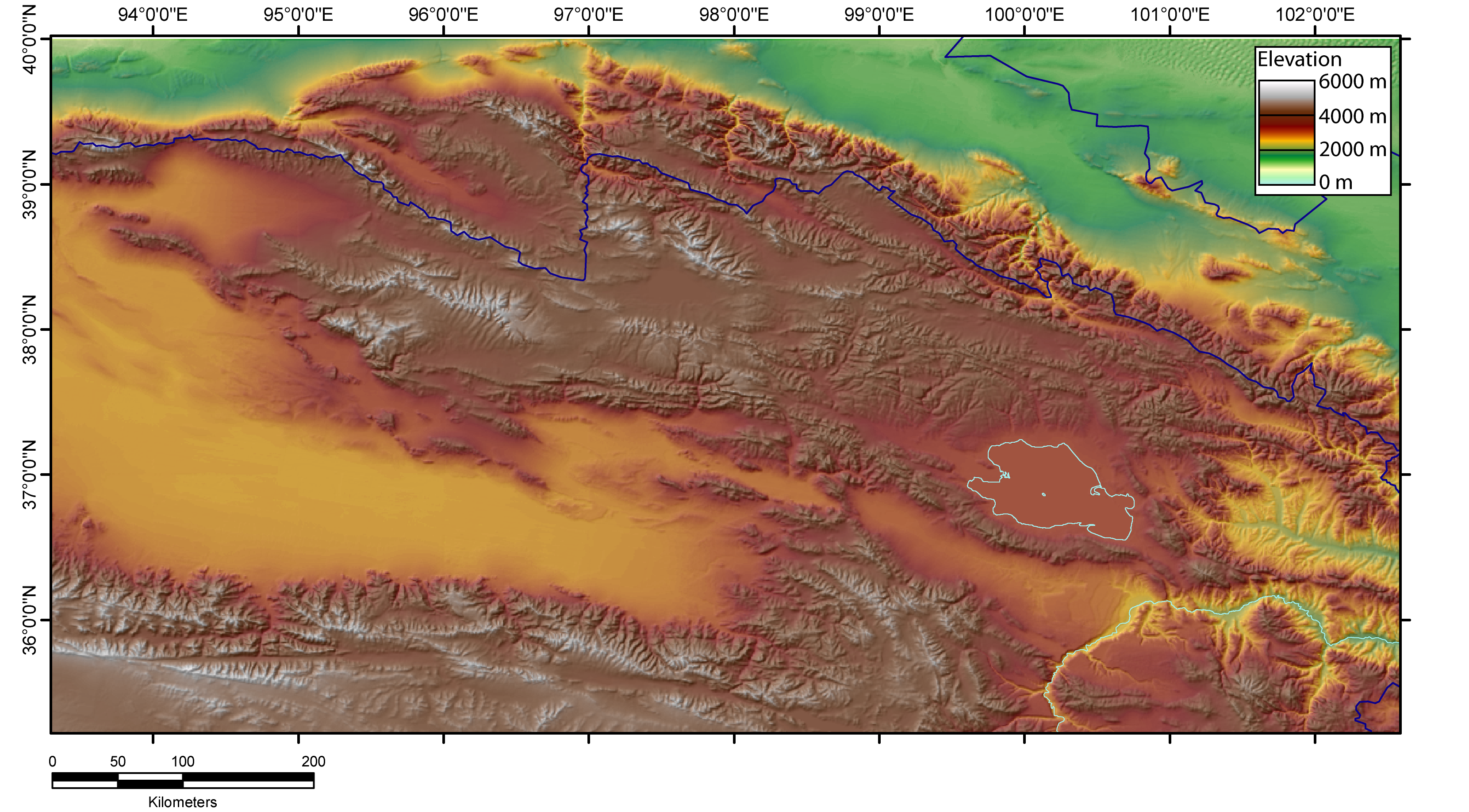 DEM of the Qilian mountains (China) created by Jide from the GTOPO30 database. |