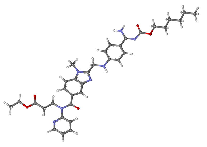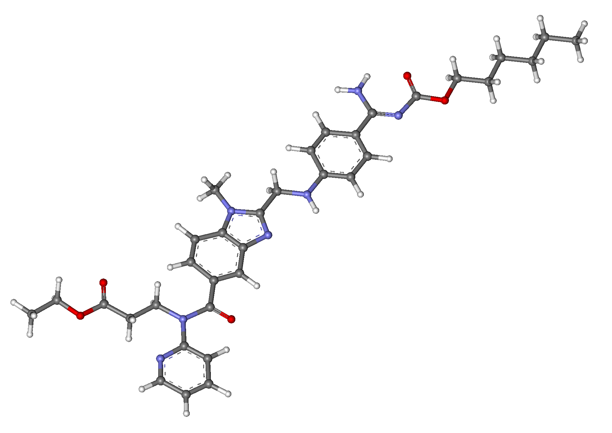 English: Ball-and-stick model of dabigatran etexilate molecule. The structure is taken from ChemSpider. ID 4948999