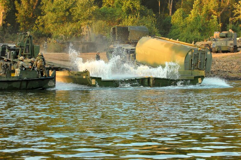 English: Soldiers launch and position bridge bay sections during River Assault 2011 on Fort Chaffee, Ark., July 27, 2011.