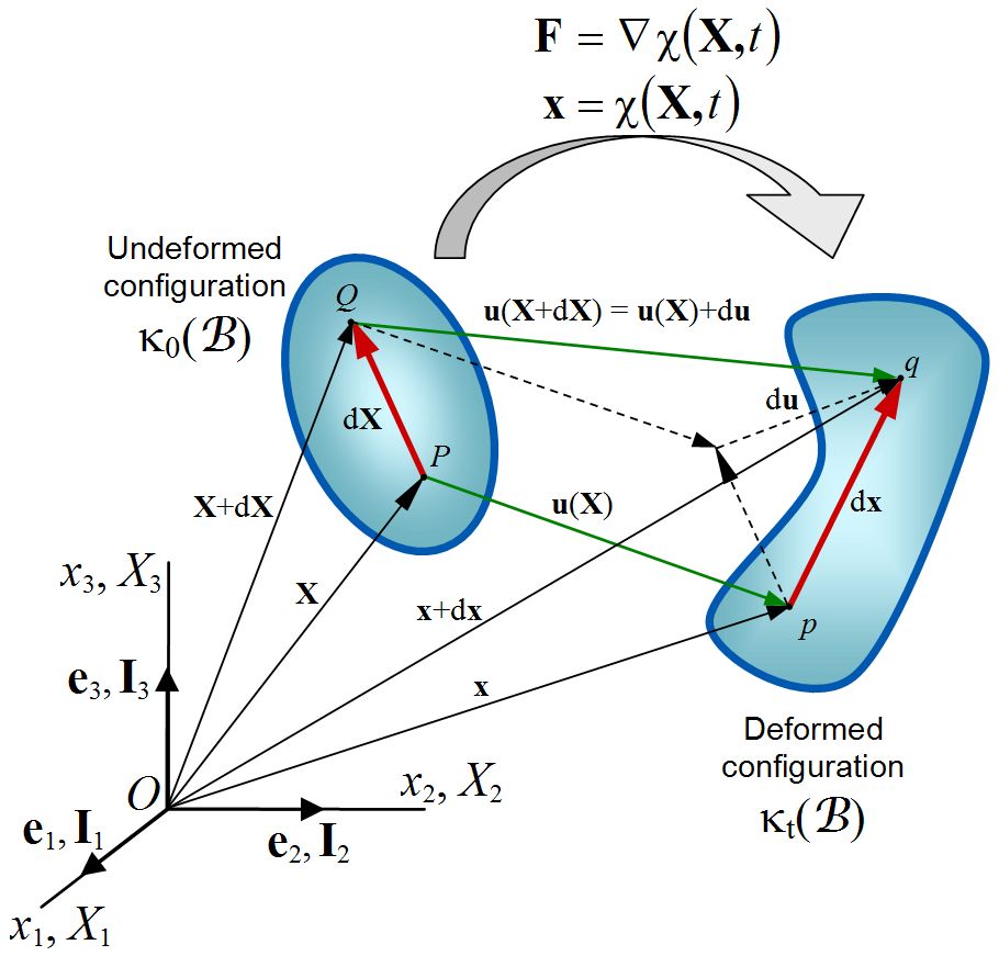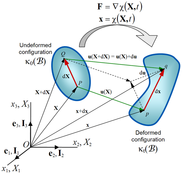 English: Deformation of a continuum body from an undeformed configuration to a deformed configuration. For articles related to deformation and strain (mechanics), i.e. Continuum Mechanics.