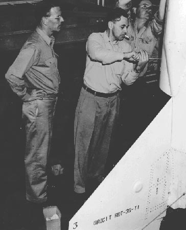 Louis G. Dunn (1908-1979), 3rd director of the Jet Propulsion Laboratory. In this 1947 photo, Dunn is shown doing last minute adjustments on a Corporal missile at the White Sands Missile Range in New Mexico, shortly before it is launched. |