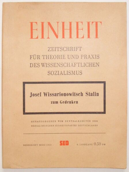 Einheit. Zeitschrift für Theorie und Praxis des wissenschaftlichen Sozialismus. Josef Wissaronotisch Stalin zum Gedenken. Herausgegeben vom Zentralkomitee der Sozialistischen Einheitspartei Deutschlands. Sonderheft März 1953. Dietz Verlag Berlin |