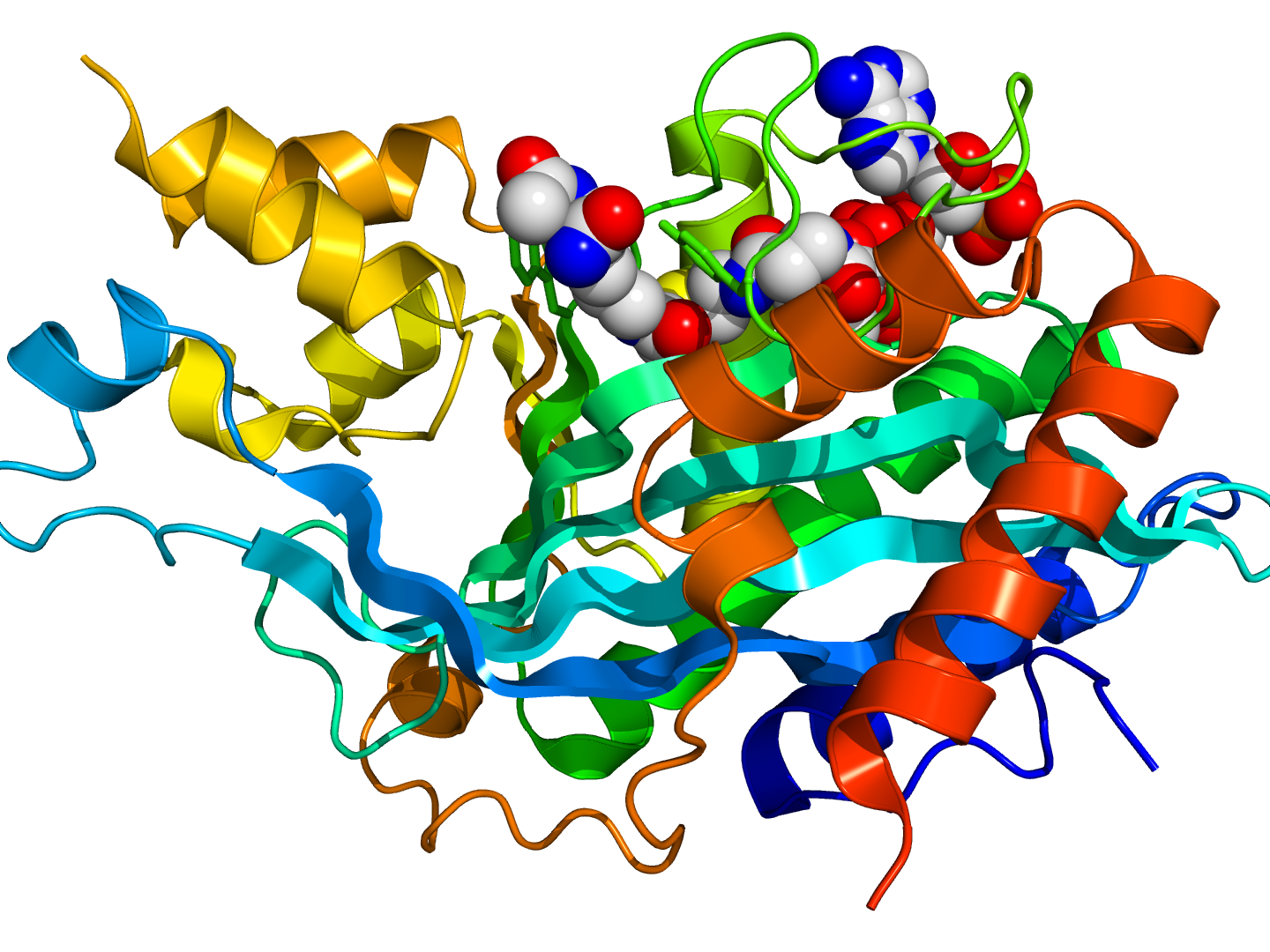Crystallographic structure of the histone acetyltransferase domain of EP300 (rainbow colored cartoon, N-terminus = blue, C-terminus = red) in complex with the inhibitor lysine-CoA (space-filling model, carbon = white, oxygen = red, nitrogen = blue, phosphorous = orange).[1] |