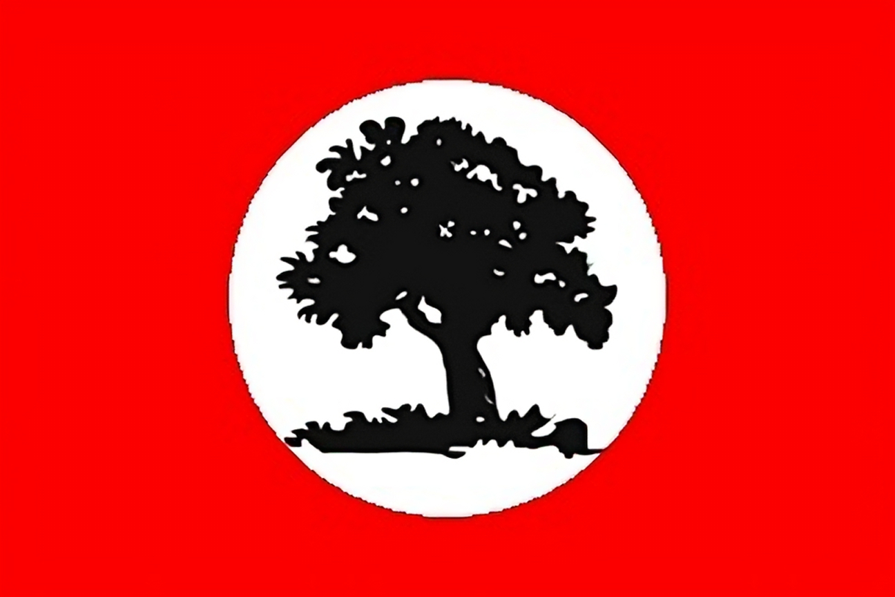 Español: Esta imagen muestra una versión modificada de la bandera del Tercer Reich. En lugar del símbolo de la esvástica, esta versión muestra un árbol negro en el centro de un círculo blanco sobre fondo rojo.