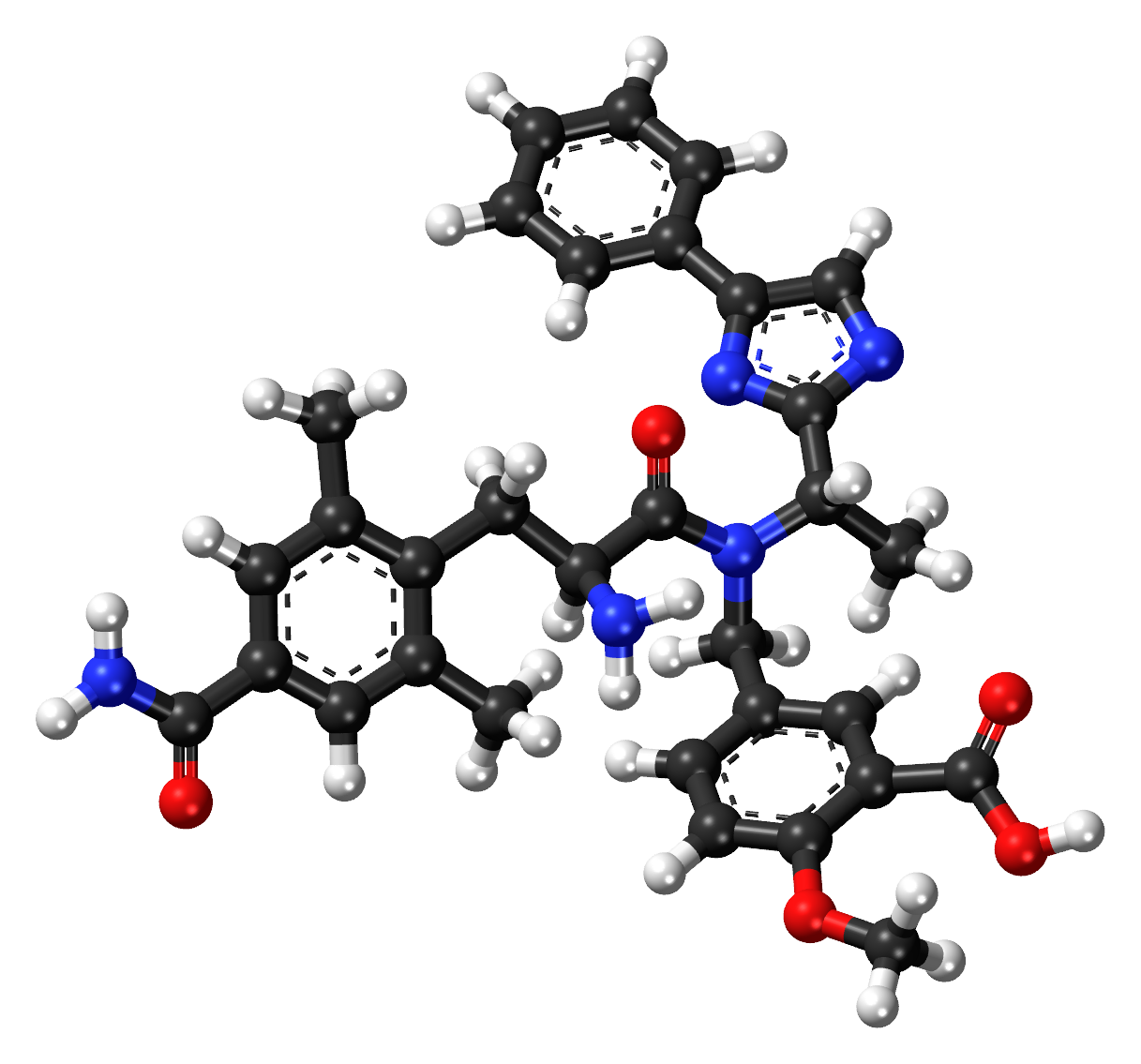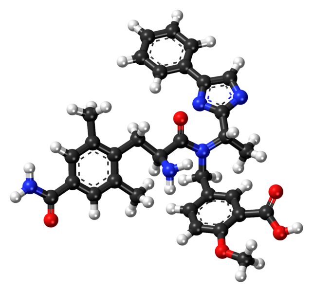 English: Ball-and-stick model of eluxadoline (brand name Viberzi)—a medication for the treatment of diarrhea-predominant irritable bowel syndrome (IBS-D). Created using Accelrys DS Visualizer 4.1 and Adobe Photoshop CC 2014.
