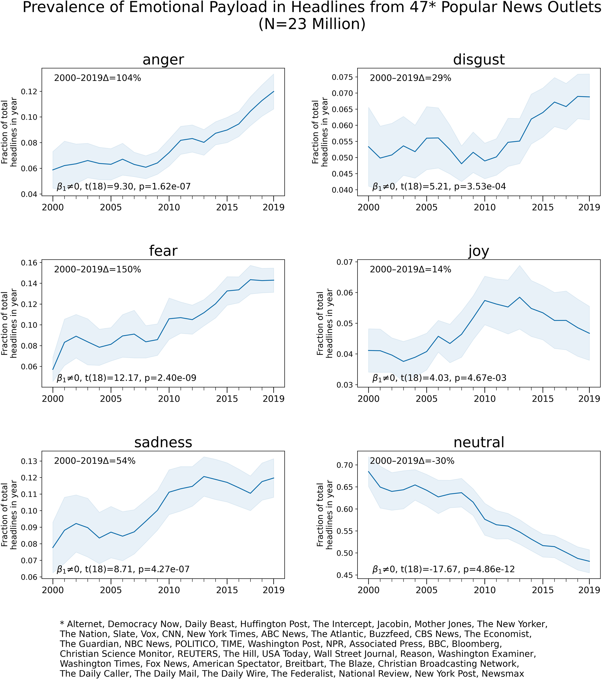 English: "Average yearly prevalence of news articles headlines denoting different types of emotionality in 47 popular news media outlets.