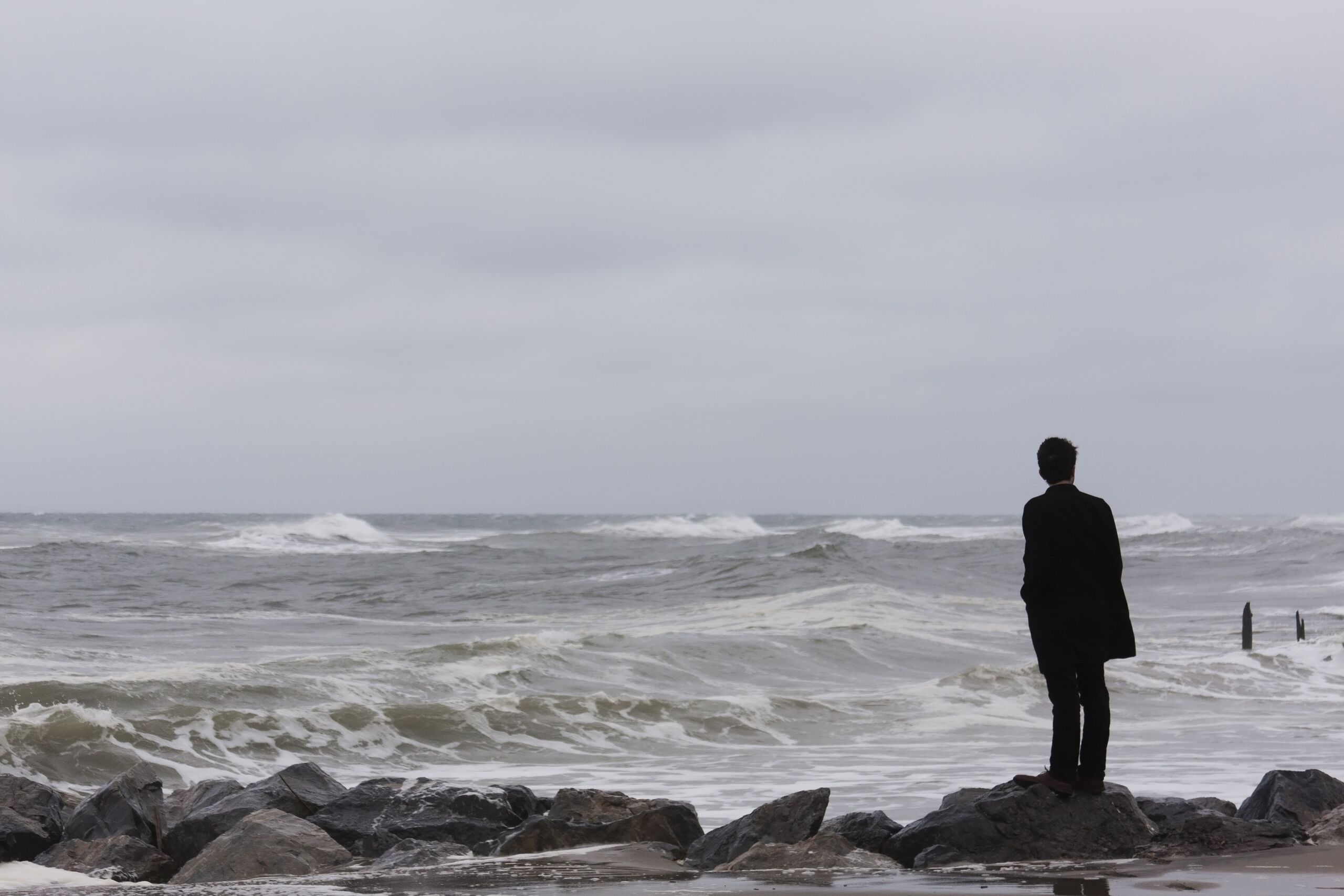 English: A man standing alone on the sea shore contemplating meaning in his life and the universe around him.