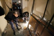 رجال شرطة فلسطينيون يتفحصون مكتب العربية بعد تفجيره