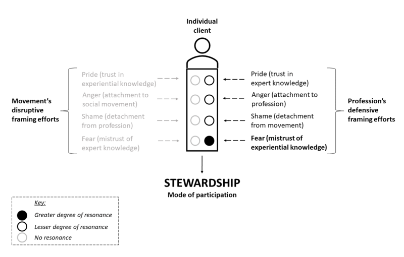 English: Figure 6 - Emotional resonance leading a client to enact the ‘stewardship’ mode of participation in the article Emotions and client participation in jurisdictional contestation published in Academy of Management Review in December 2022.