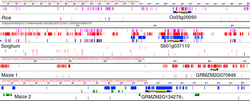 English: GEgevo comparison of Sb01g037110 to conserved syntenic orthologs in rice, and maize. Relationship between myb transcription factor gene Sb01g037110, the single most CNS rich gene in sorghum, and its syntenically retained orthologs in rice and maize. Exons of the genes in the orthologous group containing this gene are marked in yellow, exons of all other genes are marked in green. Sequences identified as homologous by blastn between sorghum and rice are identified by purple rectangles. Sequences annotated as conserved non-coding sequences by the CNS-PIPELINE version 1 are marked in dark brown on the sorghum track, second from the top. Blastn hits between and maize1/maize2 are marked with red and blue rectangles respectively. This graphic was generated using GEvo, part of the CoGe toolkit (Lyons et al., 2008a). An interactive version of this experimental result can be regenerated by visiting the following link: http://genomevolution.org/r/2bgw.