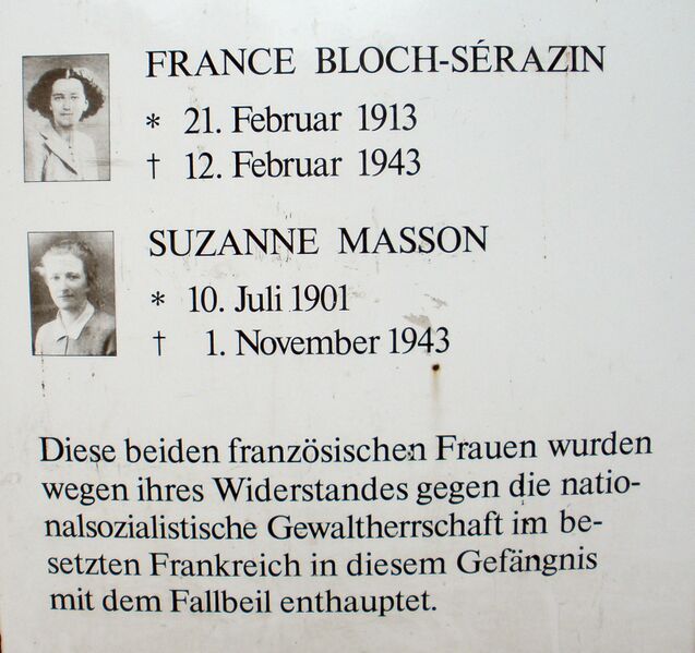 Deutsch: 1988, drei Gedenktafeln, Hamburg, Wallanlagen: eine allgemeine für die etwa 500 an diesem Ort hingerichteten Menschen während der NS-Zeit. In der Untersuchungshaftanstalt Hamburg wurde 1938 die Zentrale Hinrichtungsstätte für den norddeutschen Raum eingerichtet. Dazu wurde eigens die 1919 in das Museum für Hamburger Geschichte gebrachte Guillotine wieder zurückgeholt. Die zweite Tafel erinnert an die im Untersuchungsgefängnis 1943 hingerichteten Widerstandskämpferinnen der Résistance France Bloch-Sérazin und Suzanne Masson. Die dritte Tafel benennt die 1943 hingerichteten vier Lübecker Geistlichen, die als Lübecker Märtyrer bezeichnet werden.
