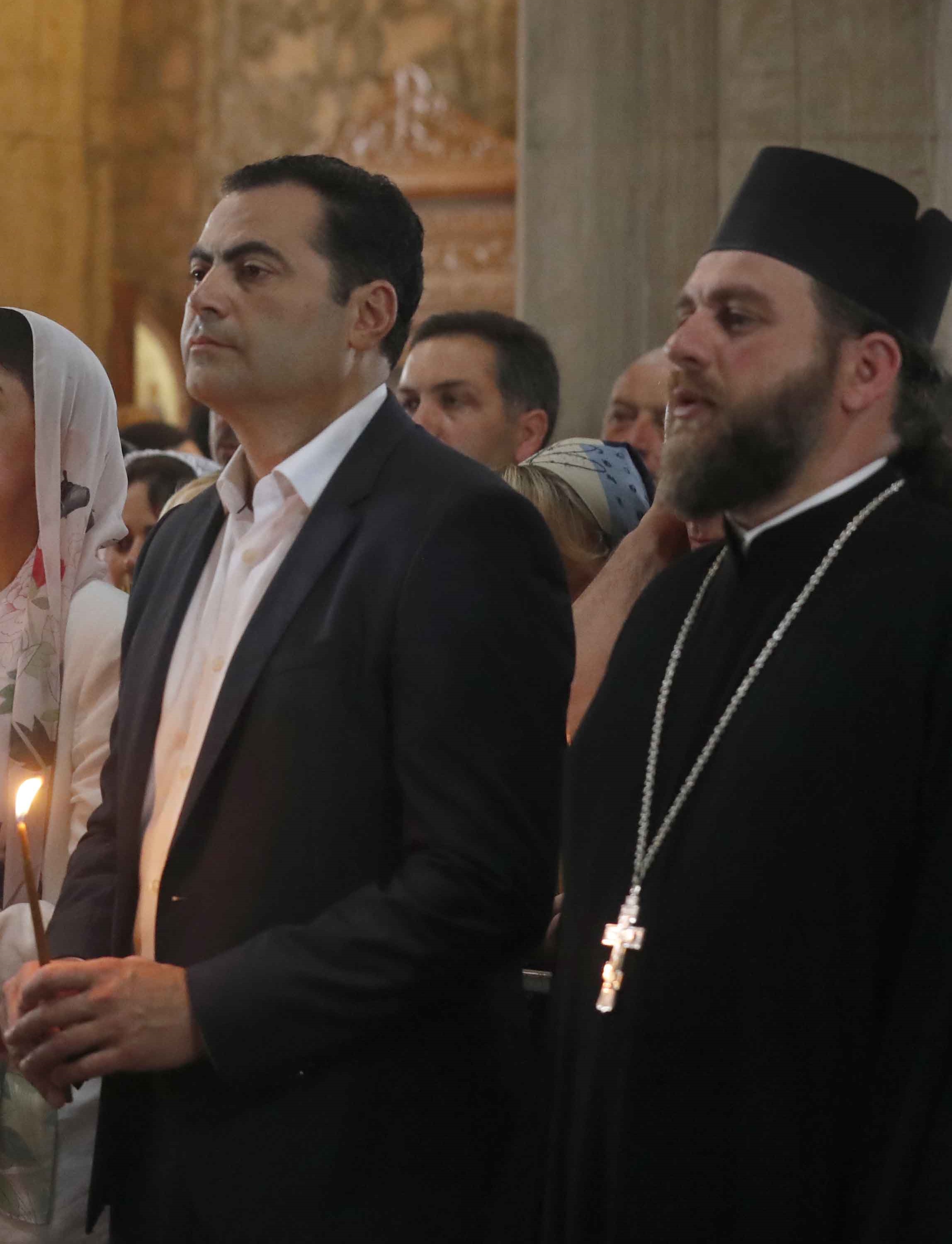 English: Zugdidi Mayor Gega Shengelia (left), Georgian President Salome Zourabichvili and Samegrelo-Zemo Svaneti Governor Alexandre Motserelia praying at the Cathedral of the Holy Mother of Iberia of Zugdidi during 2020 Vlakernoba.