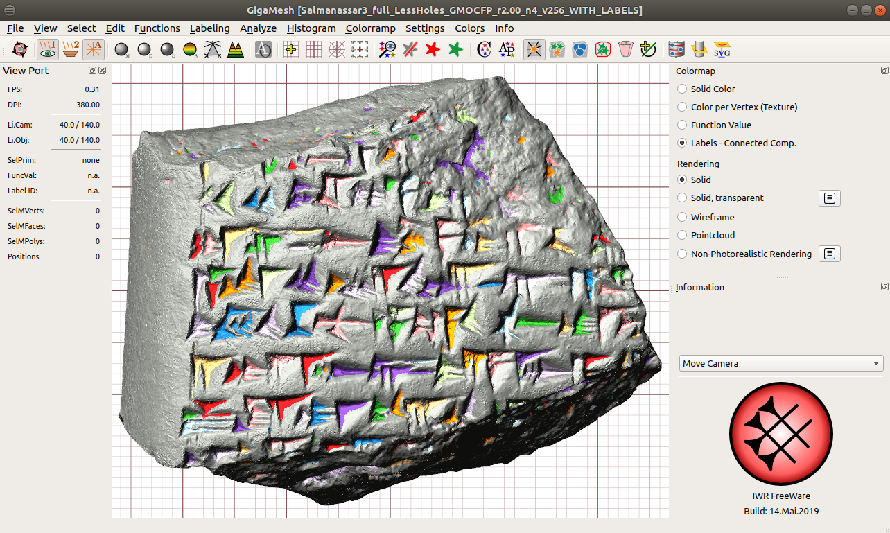 Deutsch: Bildschirmfoto von GigaMesh v.190514. Das gezeigte 3D-Modell ist ein Fragment einer Keilschrifttafel von Salmanassar III mit segmentierten Gruppen von Keilen.