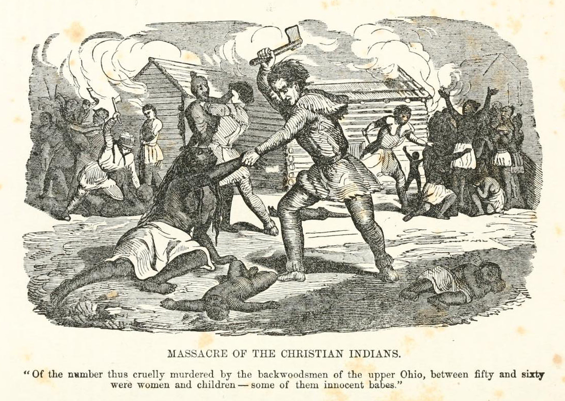 English: Engraving of the Gnadenhutten massacre from 1852, from Henry Howe's book "Historical Collections of the Great West". Artwork description: "Massacre of the Christian Indians. - Of the number thus cruelly murdered by the backwoodsmen of the upper Ohio, between fifty and sixty were women and children - some of them innocent babes."
