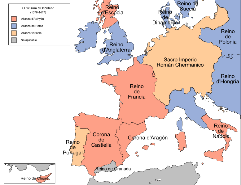 | [This is a retouched picture, which means that it has been digitally altered from its original version. Modifications: Converted to SVG. Apologies, I don't speak French.. The original can be viewed here: Grand_schisme_1378-1417.png. Modifications made by Mipmapped.] Error: {{Lang}}: text has italic markup (help)