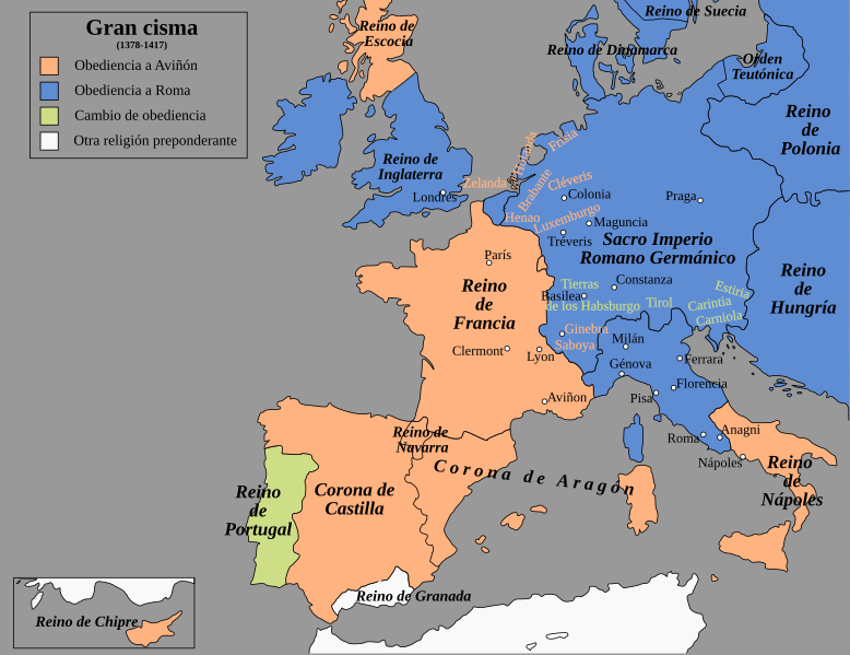 | حالي | ★ مراجعة معتمدة 10:42، 4 نوفمبر 2023 | 1٬002 × 772 (700 كيلوبايت) | Pastakhov (نقاش | مساهمات) | Upload https://upload.wikimedia.org/wikipedia/commons/0/01/Grand_schisme_1378-1417-es.svg |