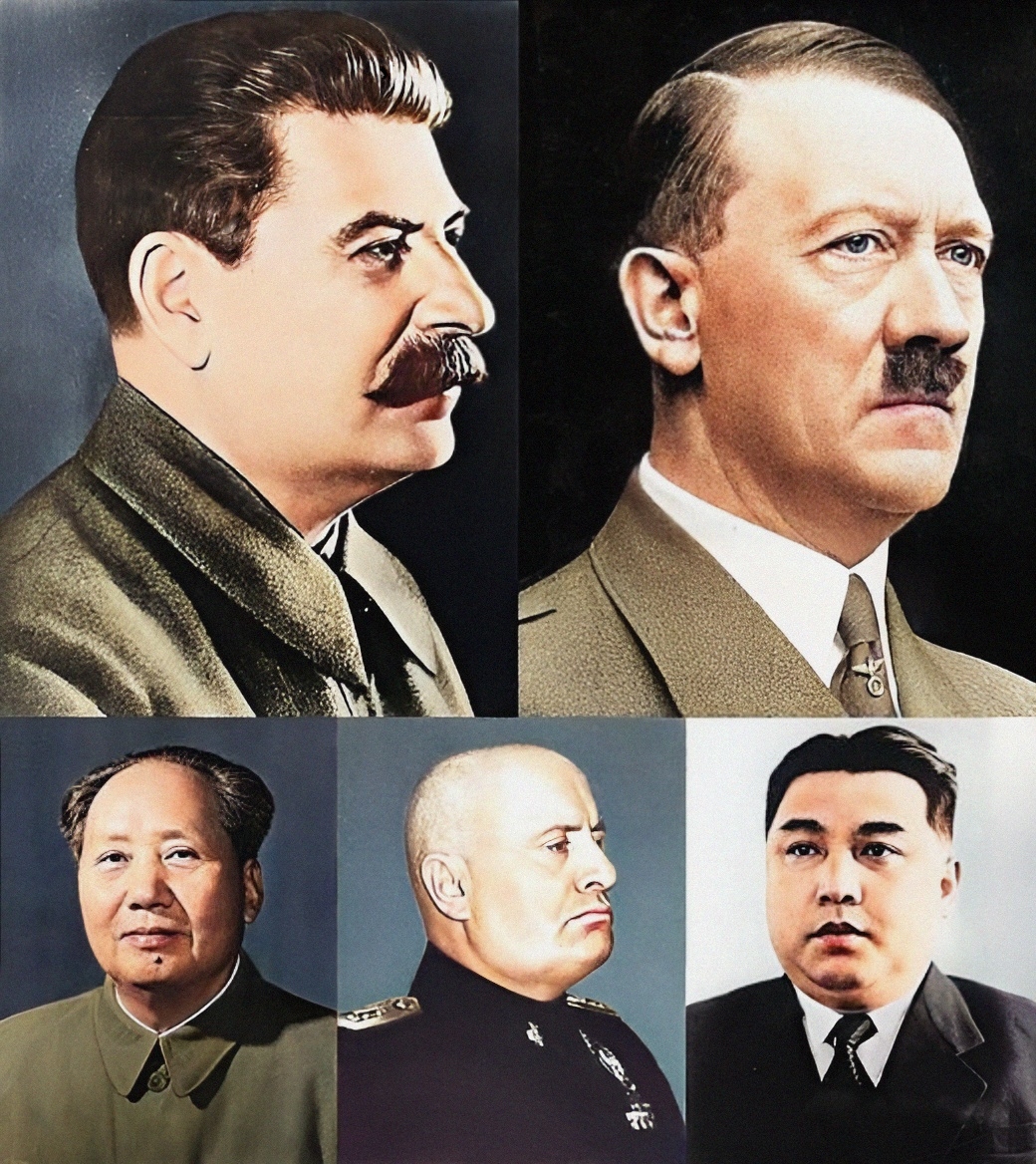 Collage of accused totalitarian leaders (each row - left to right) Joseph Stalin, Adolf Hitler, Mao Zedong, Benito Mussolini, and Kim Il-sung. Individual pictures: |