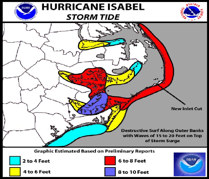 Storm Tide Graphic due to Hurricane Isabel, with tide listed in feet above MSL |