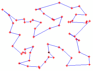 En rundtur erhållen efter simulerad evolution i 1500 generationer. I varje generation har 60 av 180 kortlekar (individer) selekterats. Copyright (c) 2006-08-24 Gregor Kjellström. Permission is granted to copy, distribute and/or modify this document under the terms of the GNU Free Documentation License, Version 1.2 or any later version published by the Free Software Foundation; with no Invariant Sections, no Front-Cover Texts, and no Back-Cover Texts. A copy of the license is included in the section entitled "GNU Free Documentation License". |