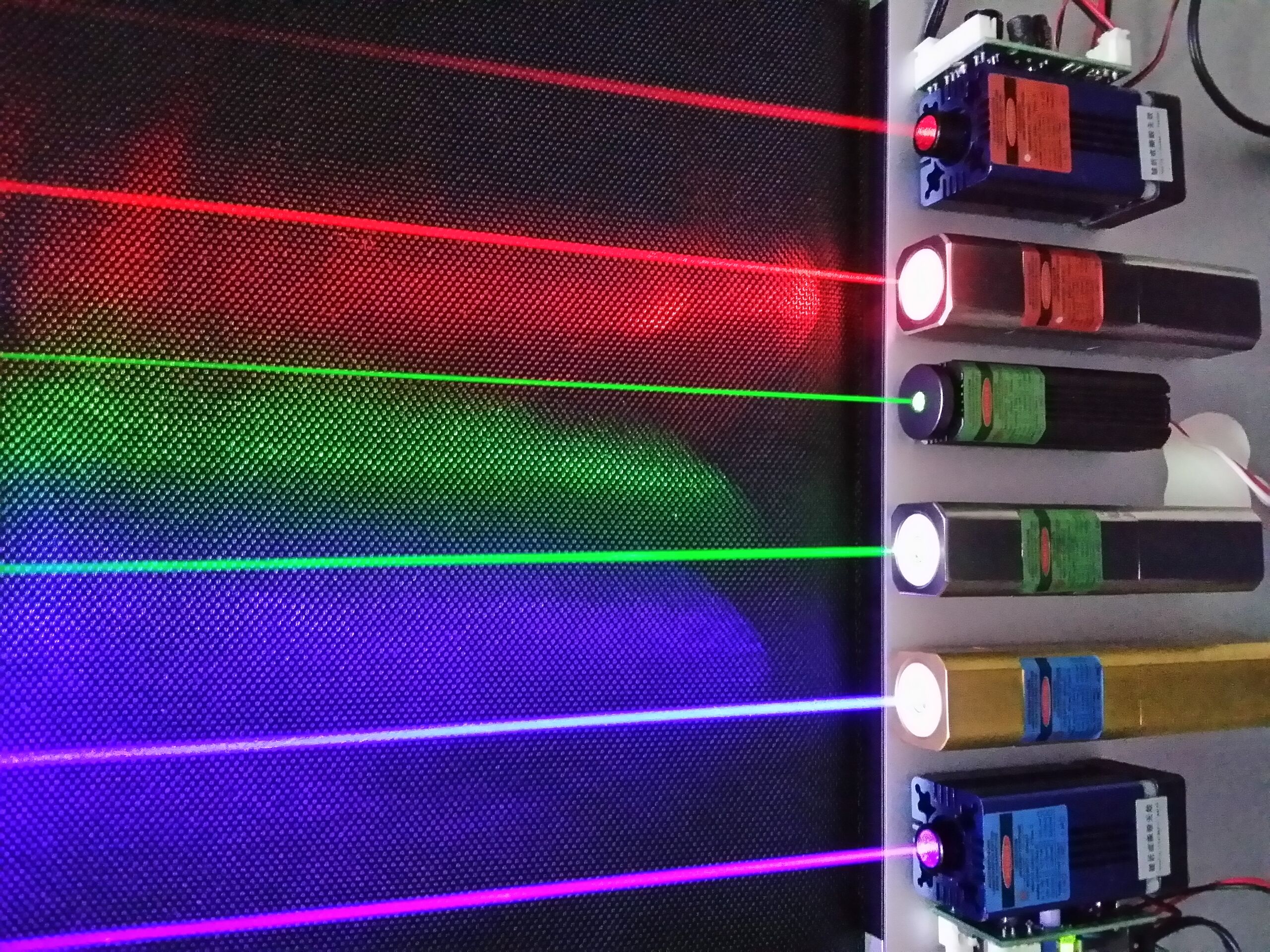 English: Six commercial lasers in operation, showing the range of different colored light beams that can be produced, from red to violet. From the top, the wavelengths of light are: 660nm, 635nm, 532nm, 520nm, 445nm, and 405nm. Manufactured by Q-line.