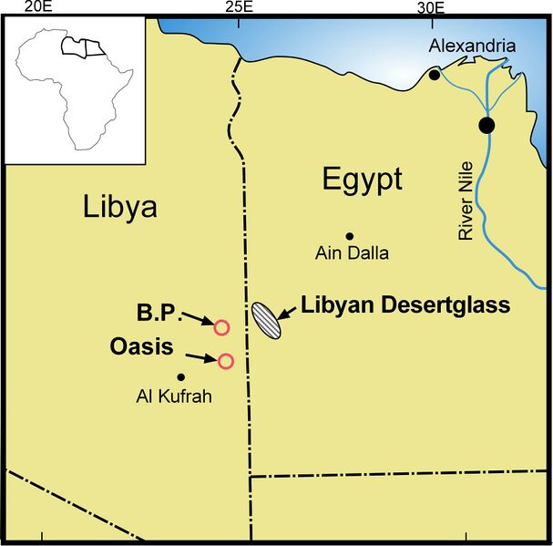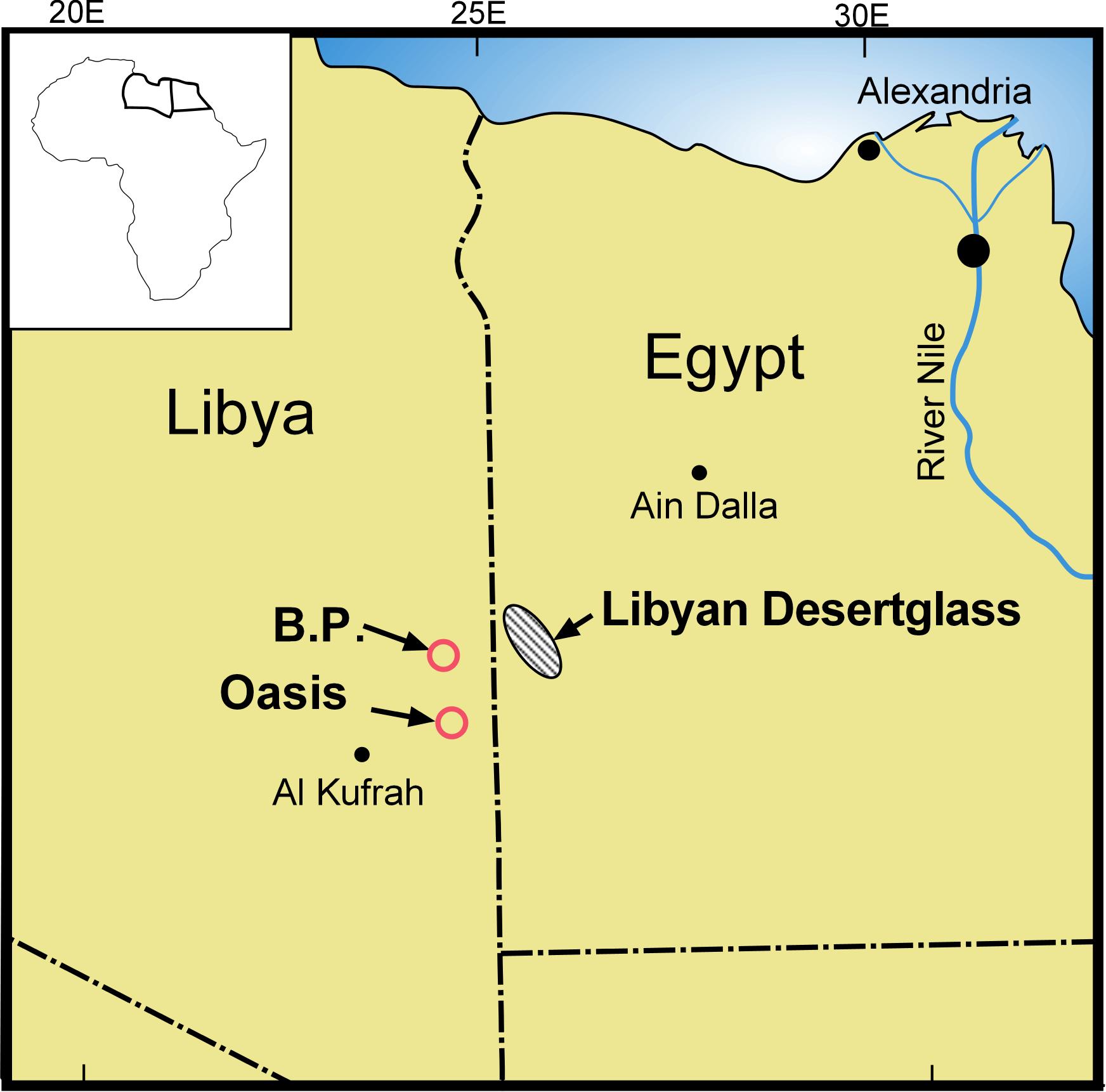 English: Map of the Libyan Desert Glass field and and two possible impact structures in the Libyan-Egyptian Libyan Desert.