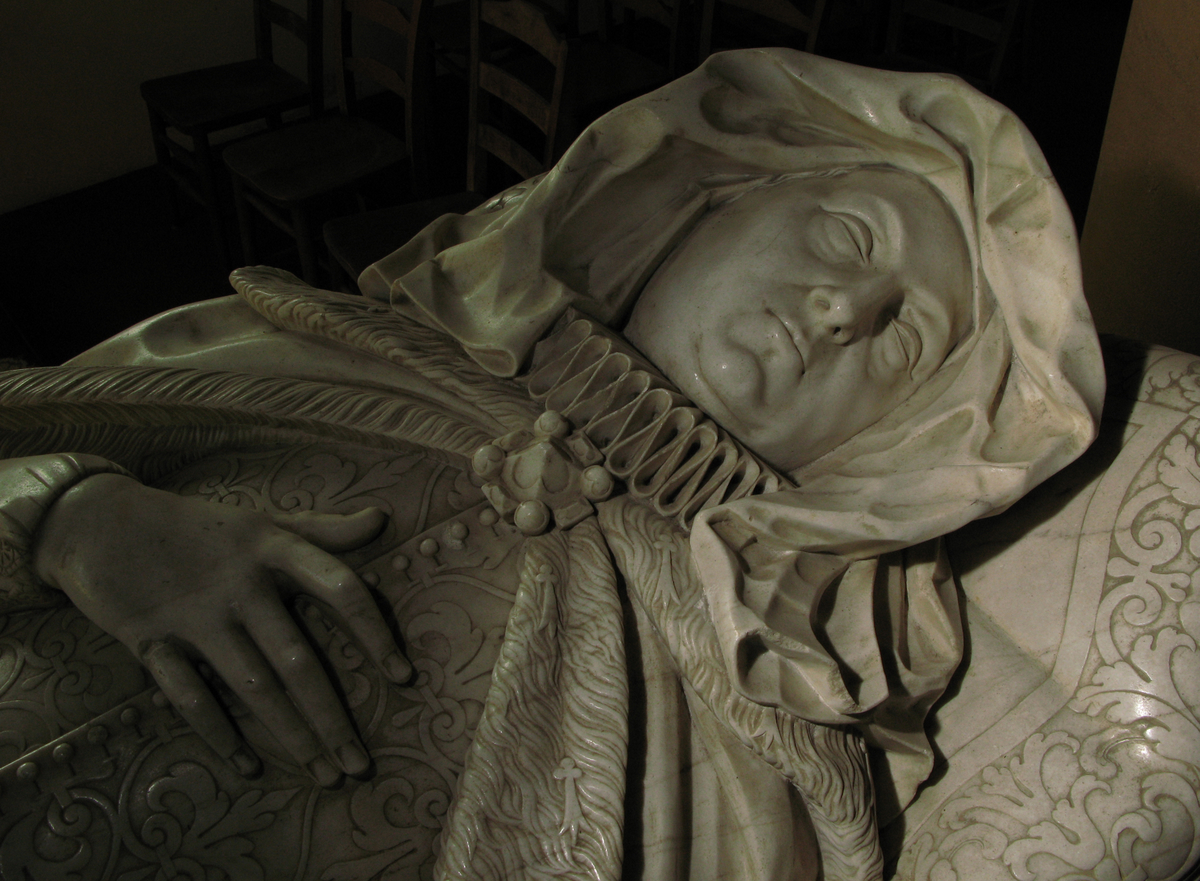 English: Monument to Lady Elizabeth Carey (1545/50–1630), also known as Elizabeth Danvers, née Neville) in St Michael's parish church, Church Stowe, Northamptonshire, England. The stonework is by Nicholas Stone, master mason to James I (and then Charles I). It was put up during the subject's lifetime (1617-20). The quality of the carving is extremely fine.