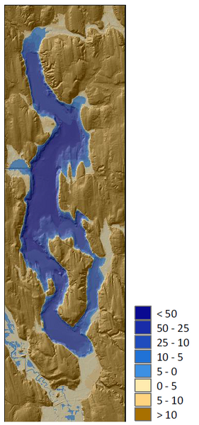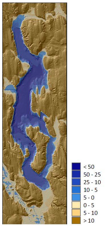 English: Bathymetric map of Lake Washington, Washington state, U.S., with depth in meters, and topographic map of surrounding areas