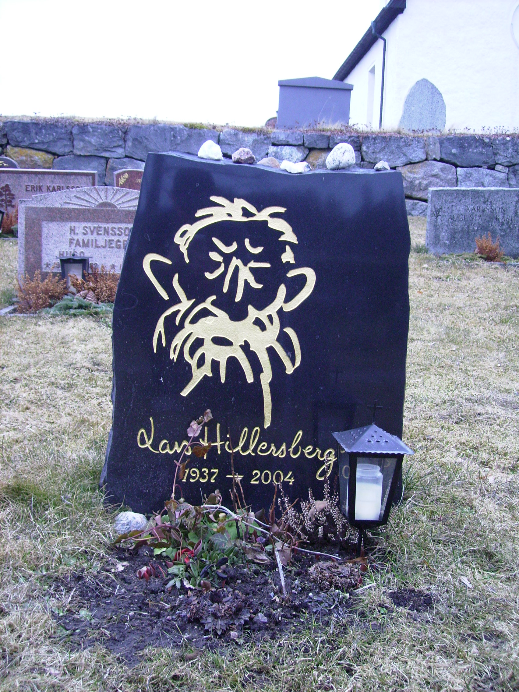 Svenska: Foto av Lars Hillersbergs grav pa Frustuna kyrkogard, mars 2009. Karikatyrernas förlagor är två tidiga teckningar av John Andersson