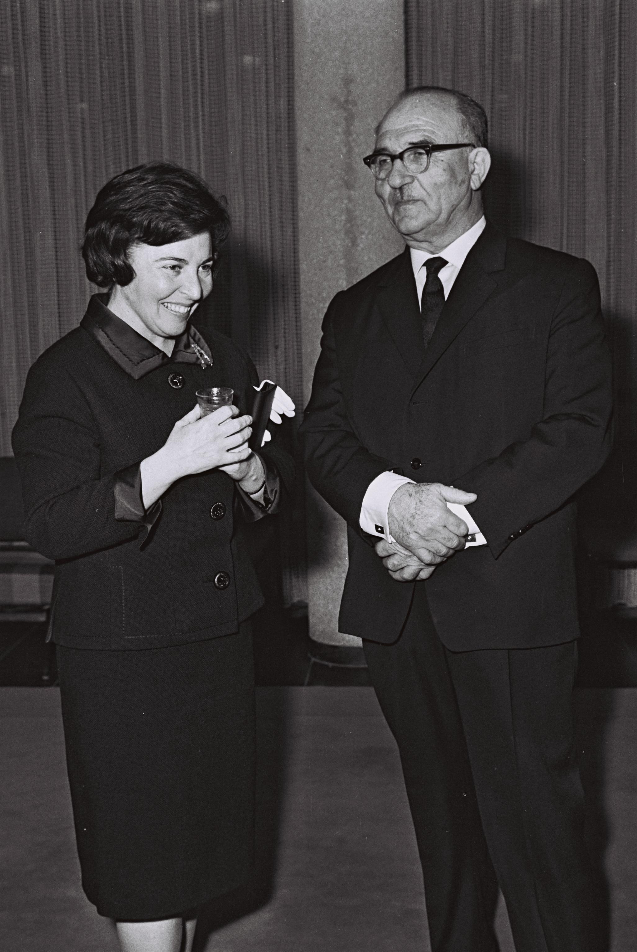 English: P.M. LEVY ESHKOL AND HIS WIFE MIRIAM DURING A RECEPTION FOR THE ZIONIST EXECUTIVE COMMITTEE AT BEIT ELISHEVA IN JERUSALEM.