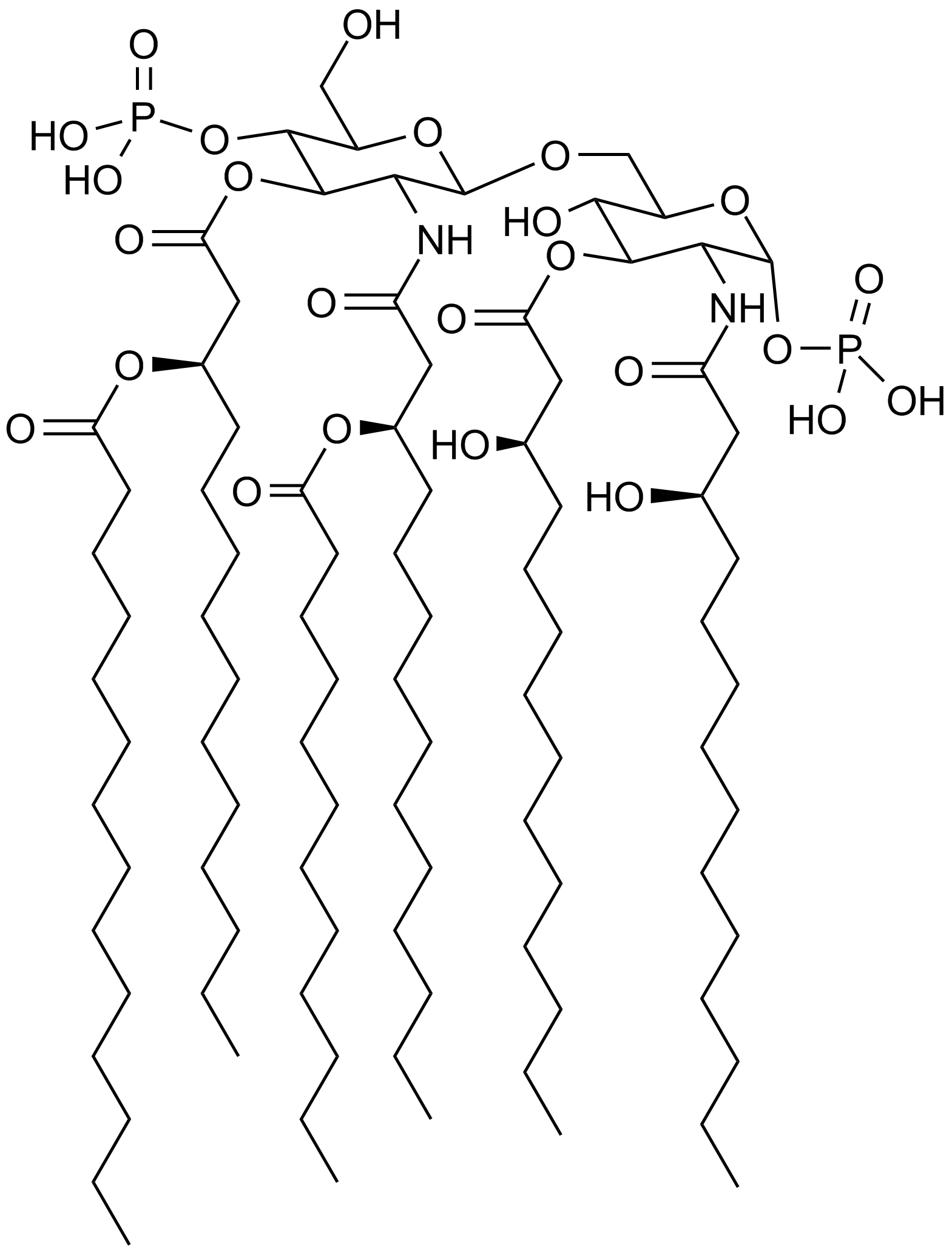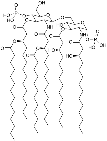 English: Chemical structure of the saccharolipid lipid A as found in E. Coli. Based on descriptions in: Raetz, Christian R. H.; Guan, Ziqiang; Ingram, Brian O.; Six, David A.; Song, Feng; Wang, Xiaoyuan; Zhao, Jinshi. Discovery of new biosynthetic pathways: the lipid A story. Journal of Lipid Research (2009) S103-S108