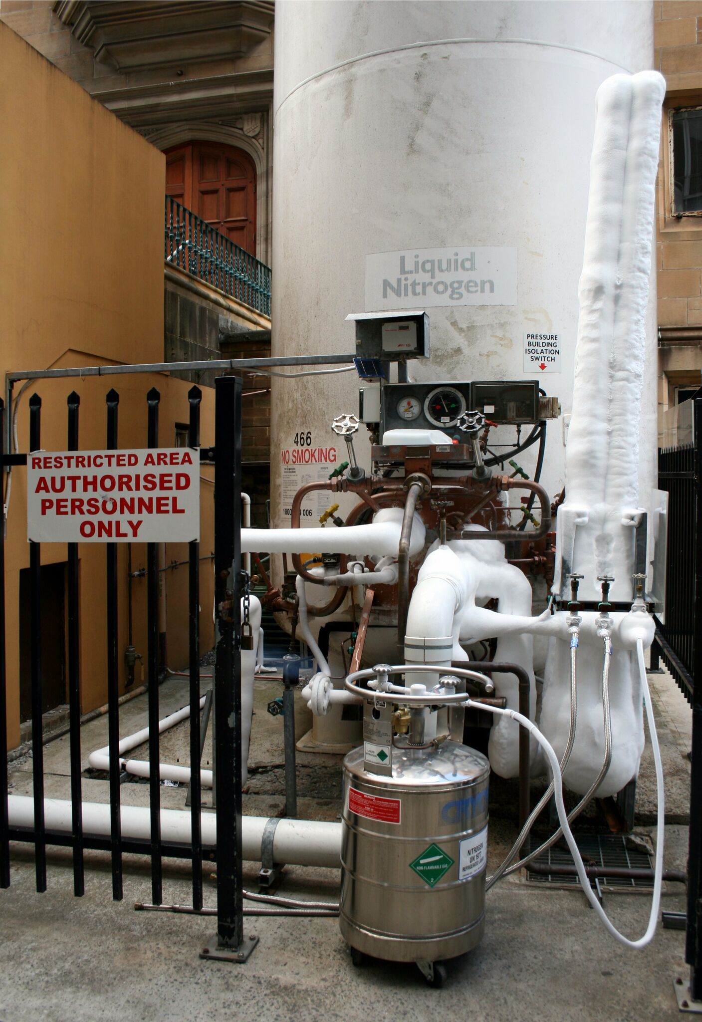 English: Liquid nitrogen storage facility at the School of Chemistry, The University of Sydney, New South Wales (NSW), Australia. Nitrogen is flowing into the metallic tank/dewar, and a bluish exhaust jet can be seen to the left, which is used to release the pressure of any evaporating nitrogen. The pipes near the main tank, through which the cold nitrogen passes, have accumulated ice by condensation and freezing of atmospheric water.