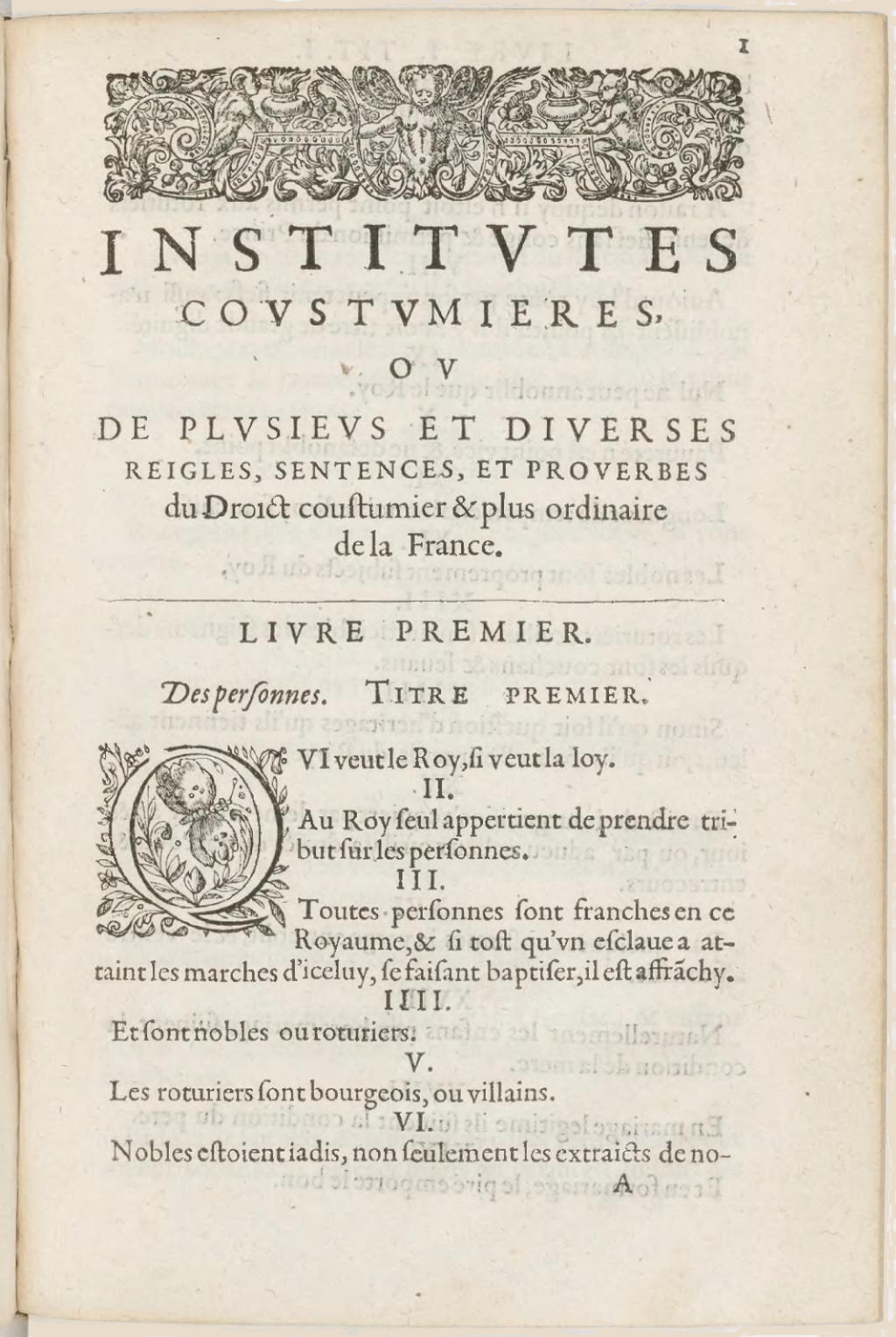 Français : Antoine Loysel (1536-1617). Institutes coutumières ou manuel de plusieurs et diverses règles, sentences, & proverbes du droit coutumier & plus ordinaire de la France, Livre Premier, page I, article I à VI, Abel L'Angelier, Paris, 1607.