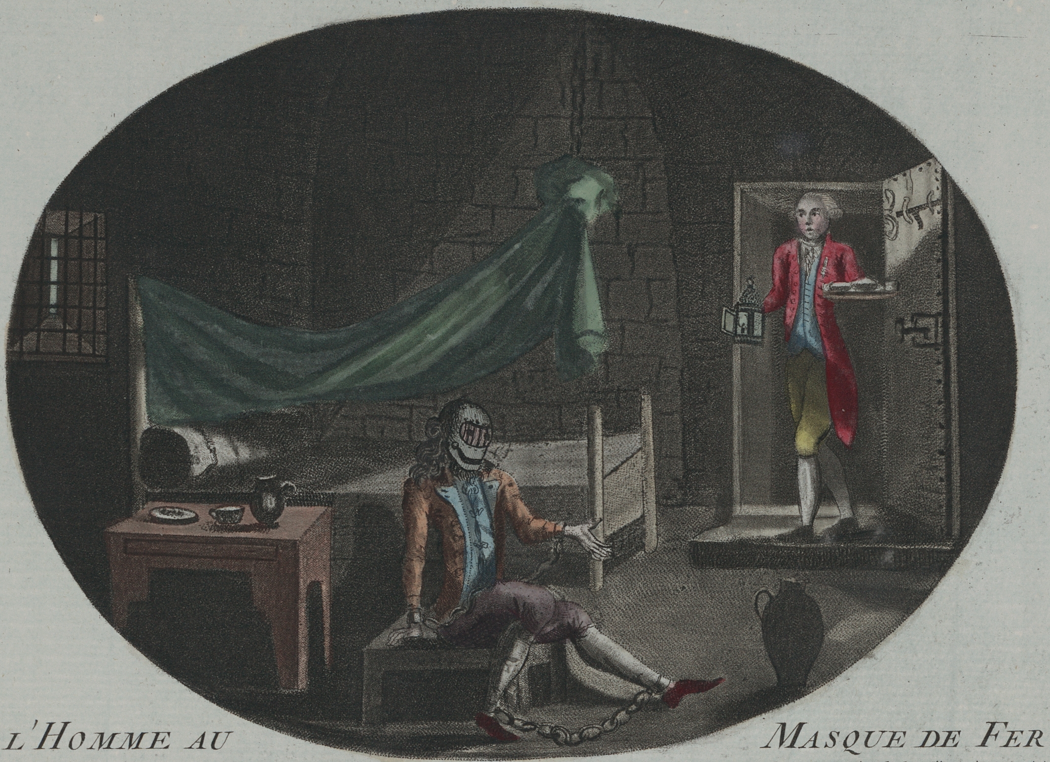 "L'Homme au Masque de Fer" ("The Man in the Iron Mask"). Anonymous print (etching and mezzotint, hand-colored) from 1789. According to the caption on the original (not seen here), the Man in the Iron Mask was fr:Louis de Bourbon, comte de Vermandois, an illegitimate son of Louis XIV. No evidence is given to support this claim, which is just one among many, and may have been merely a piece of revolutionary propaganda. Caption (in French, with modernized spelling): "L'Homme au Masque de Fer, ou plutôt son histoire, qui a si longtemps fixé les recherches d'une infinité d'auteurs, vient de sortir enfin du ténébreux chaos où la discrétion barbare d'intermédiaires ministériels l'avaient plongé jusqu'à présent. Des papiers trouvés à la Bastille nous apprennent que cette dénomination n'a jamais appartenu qu'à Louis de Bourbon, comte de Vermandois, fils naturel de Louis XIV, né le 2 octobre 1667, qui fut condamné à un emprisonnement perpétuel pour avoir, à l'âge de 16 ans, donné un soufflet au Dauphin. Pour envelopper ses traits d'un voile impénétrable, on lui couvrit le visage d'un masque de fer dont la mentonnière et les ressorts d'acier lui permettaient néanmoins de prendre sa subsistance. C'est en 1683 que l'on place l'époque de sa détention. Ce malheureux Prince mourut à la Bastille en 1703 après une captivité de 20 ans dans différentes prisons. (Ceux qui voudront avoir des renseignements plus étendus sur cet objet pourront consulter un papier qui se vend Rue de Chartres N°85.)" |