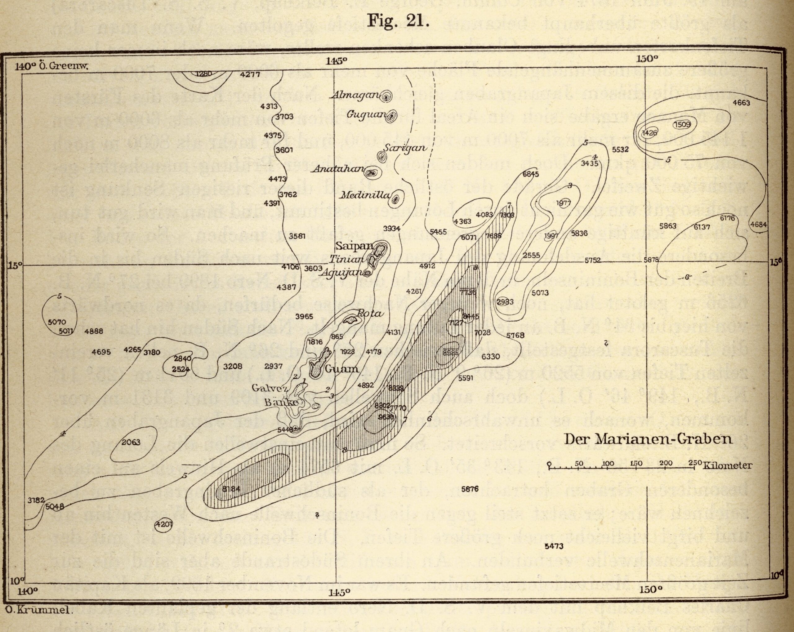 English: Otto Krummel's map of the Mariana Trench. In: "Handbuch der Ozeanographie", 1907.