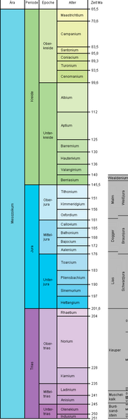 Altersangaben nach: Farbgebung angelehnt an: Stratigraphische Einordnung der Germanischen Trias, des mitteleuropäischen Jura und des Wealdenium nach: Not included from third file version onwards: |