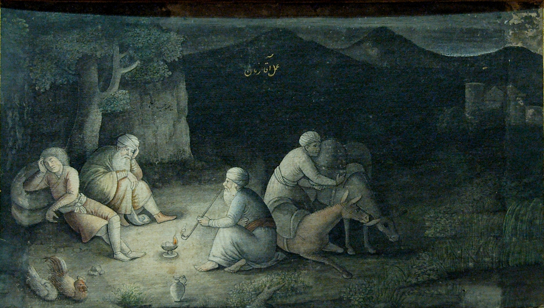 Français : La Halte de nuit de Muhammad Zaman (actif de 1649 à 1694), page d'un album de peintures et de calligraphie dont la plupart des pages sont conservées à l'Ermitage de Saint-Pétersbourg. Gouache, or et encre sur papier, 1660-1665, Iran.